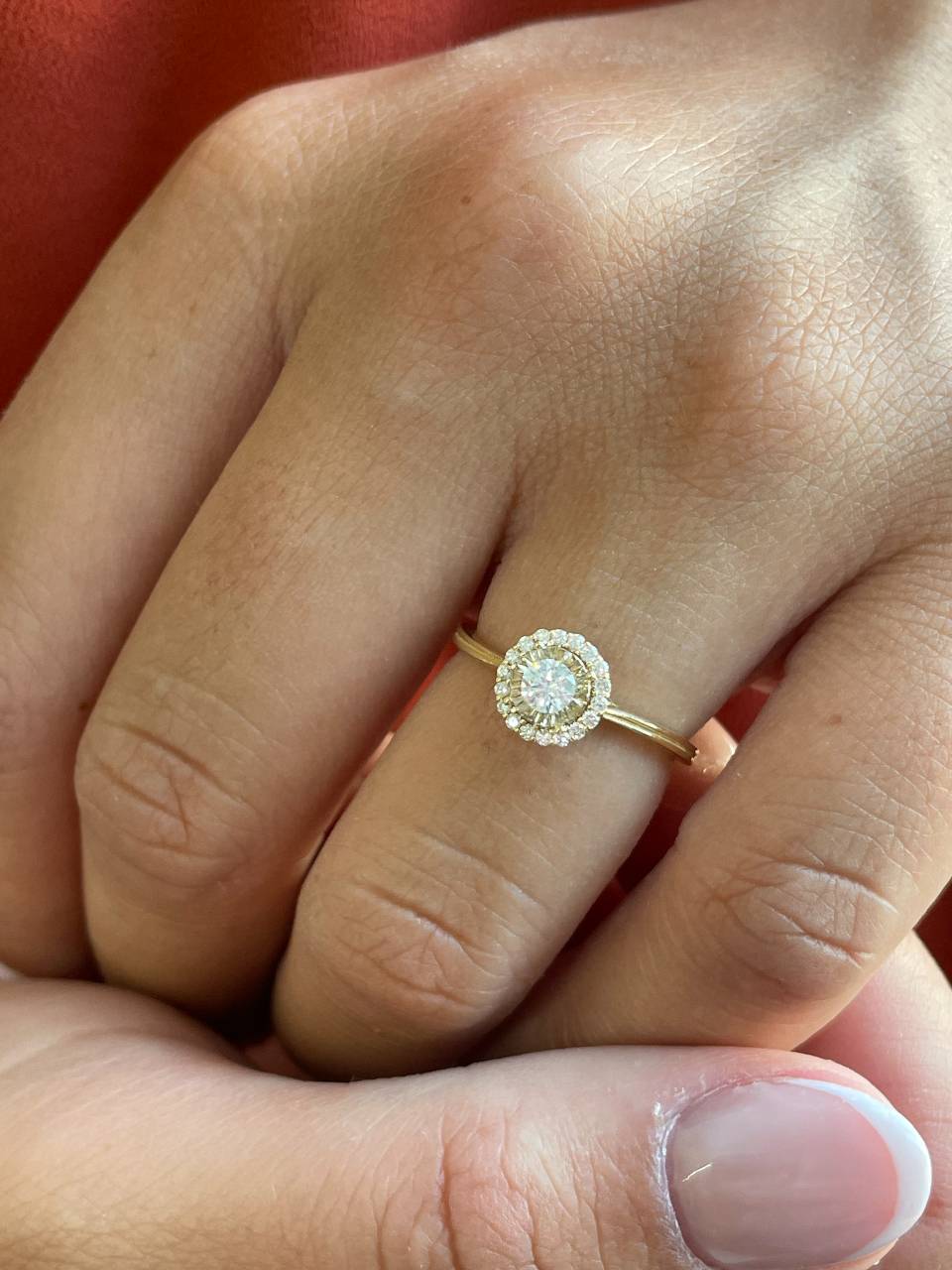 MANGABA, es un anillo de oro amarillo de 18 kilates, con centro en diamantes solitario talla brillantes con una roseta también de brillantes, sobre un brazo fino en oro liso. Muy buena elección para pedidas y aniversarios.