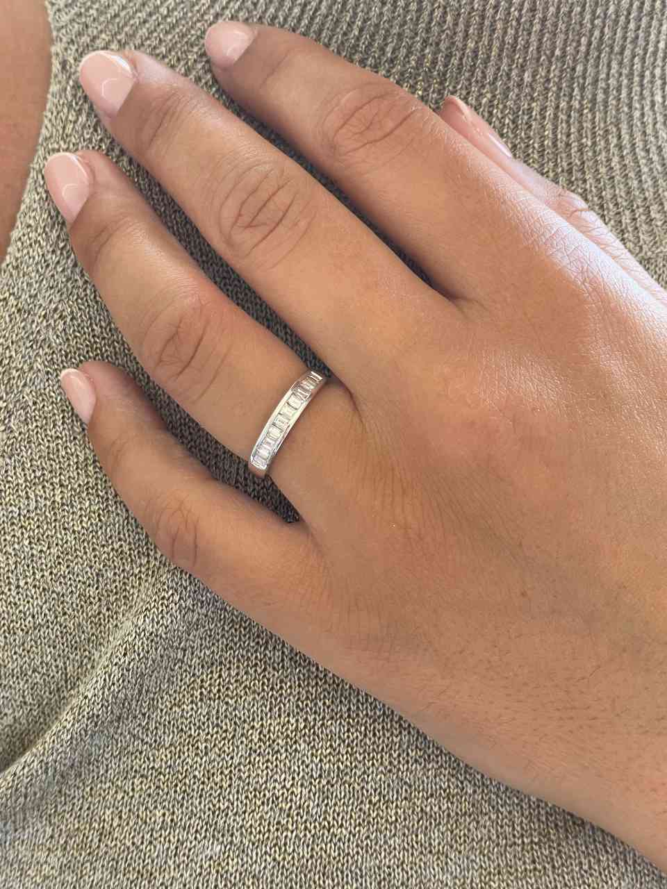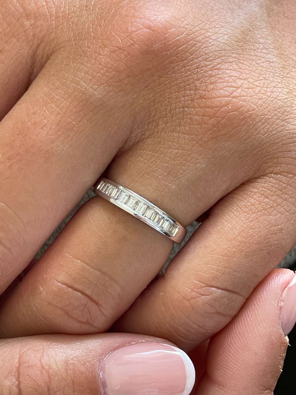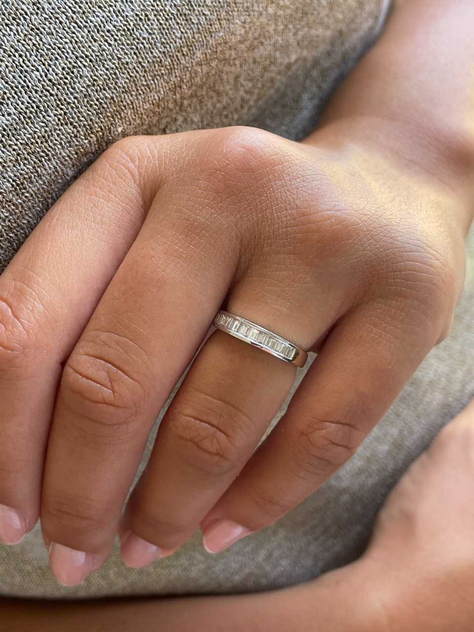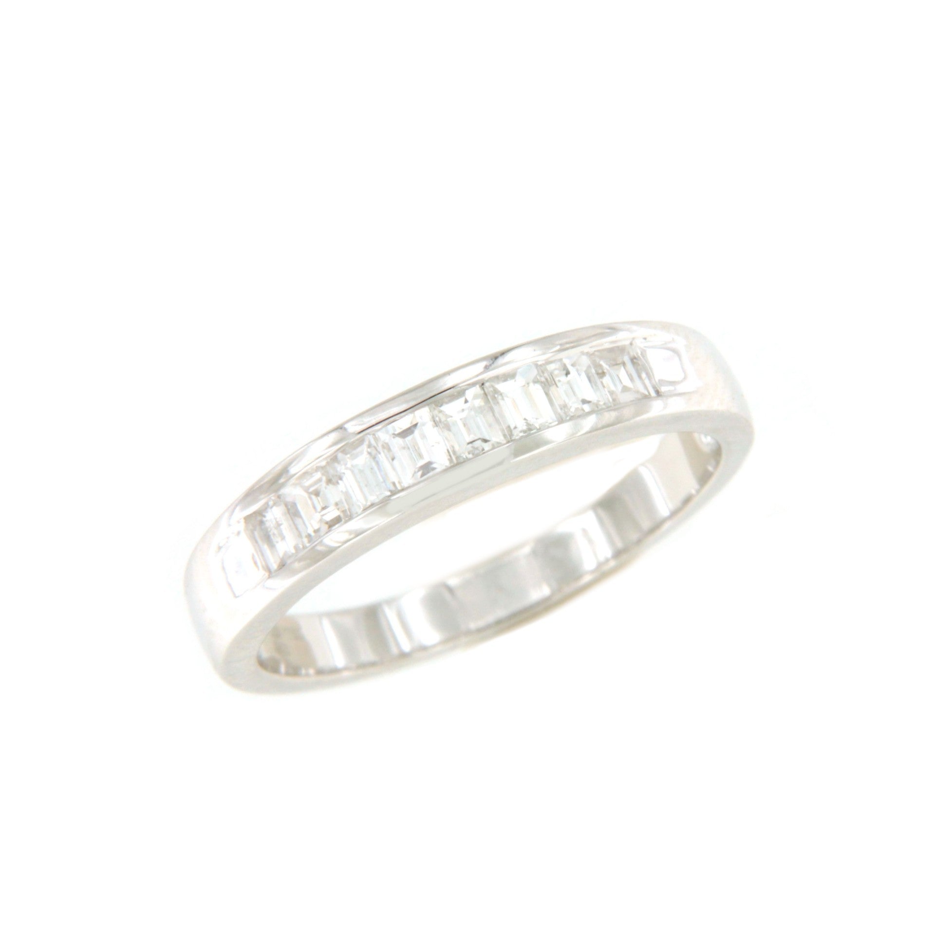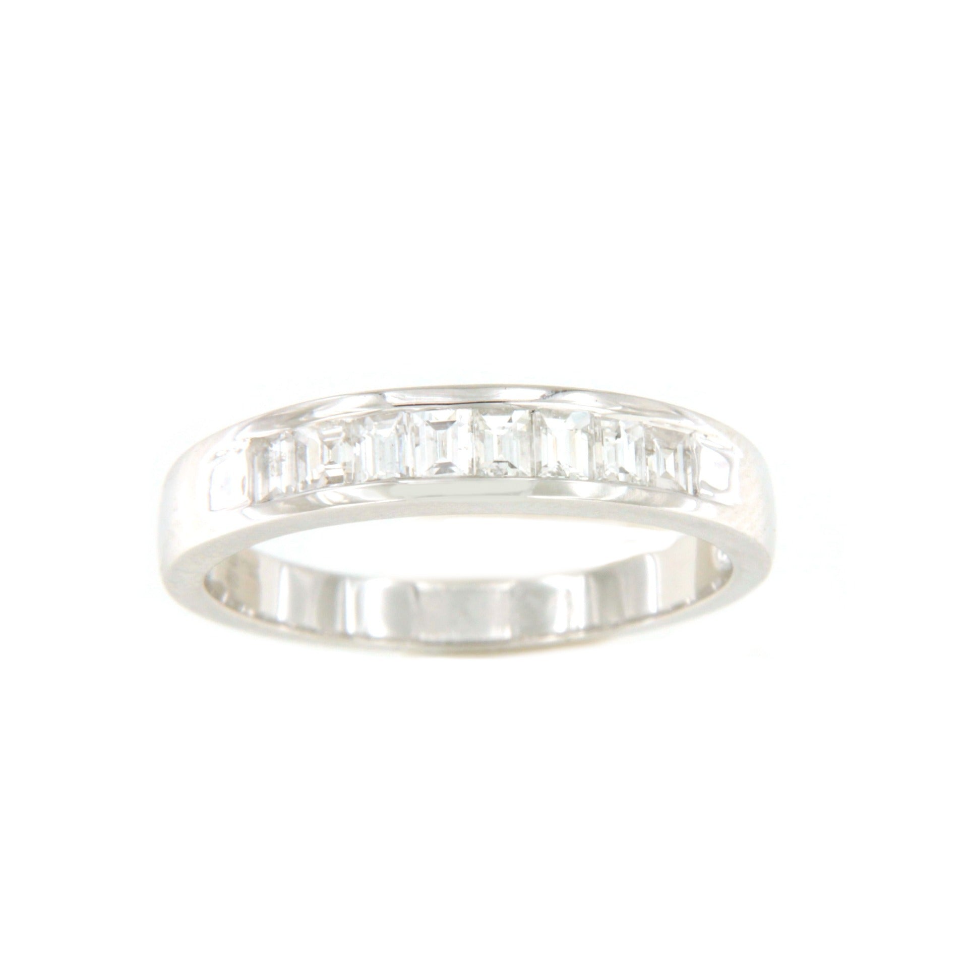 NARANJILLA, preciosa alianza de diamantes talla baguettes engastadas en forma clásica de galería. Esta realizada en oro blanco de 18 kilates.