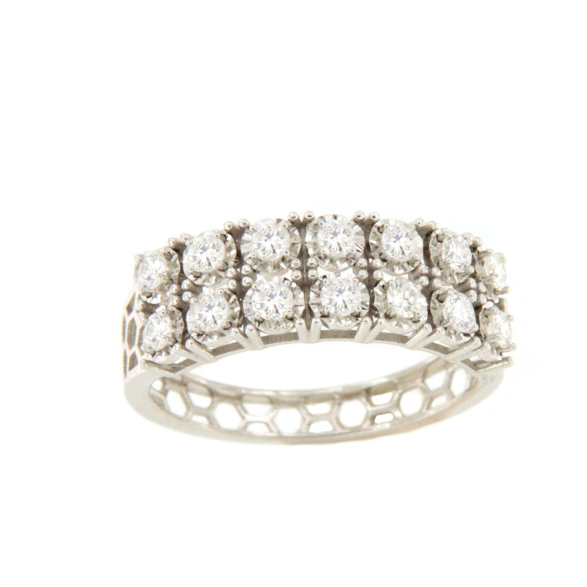 OROSEI, es un anillo de alianzas, está realizado en oro blanco de 18 kilates. Lo componen dos alianzas de brillantes unidas engastadas en garras sobre bases adiamantada que lo resalta.