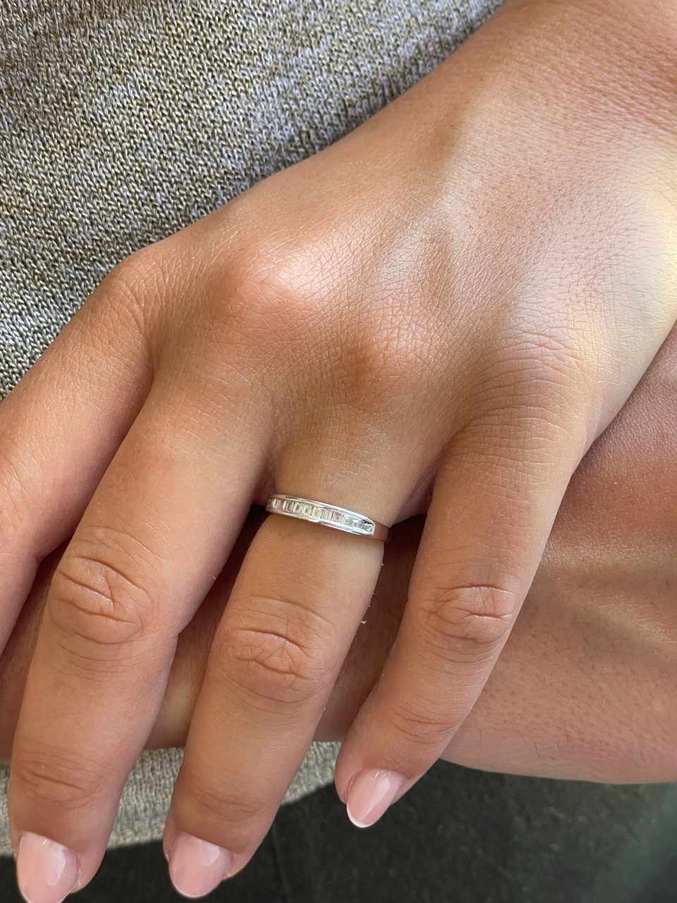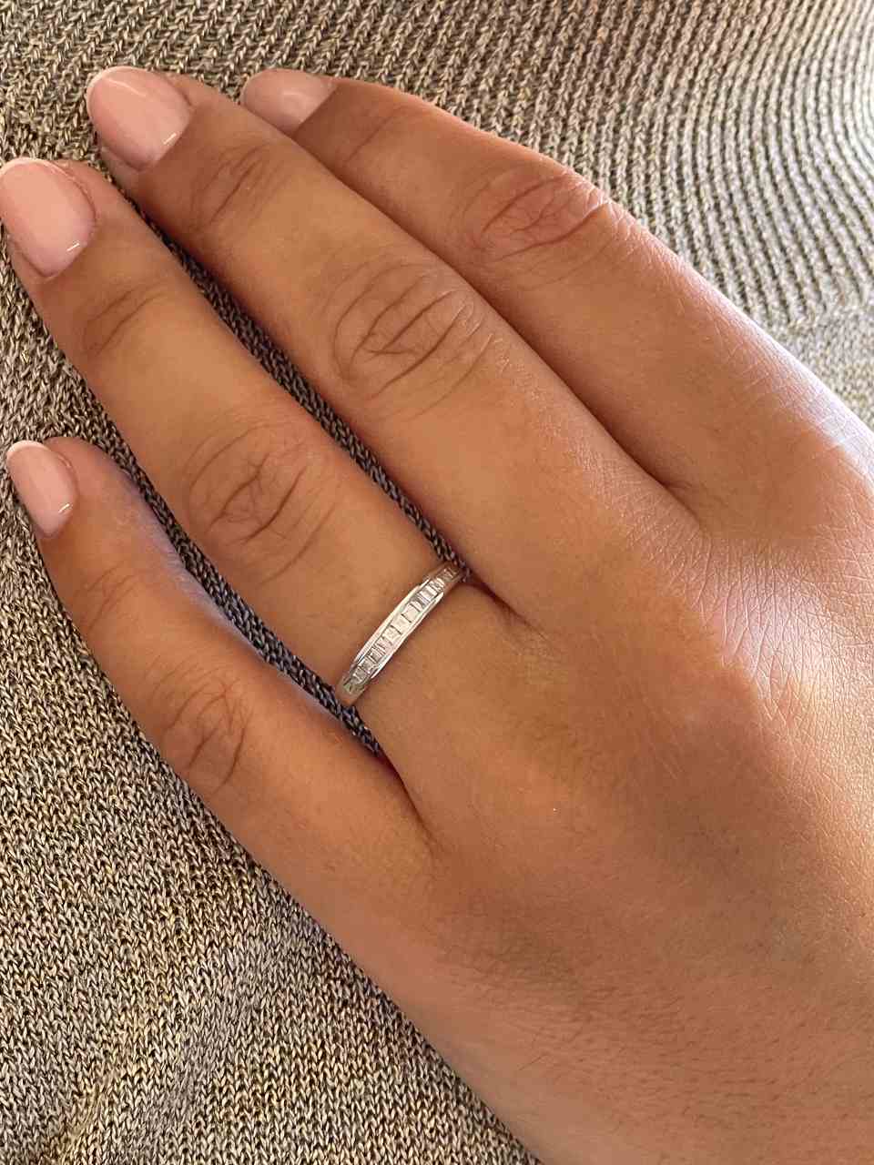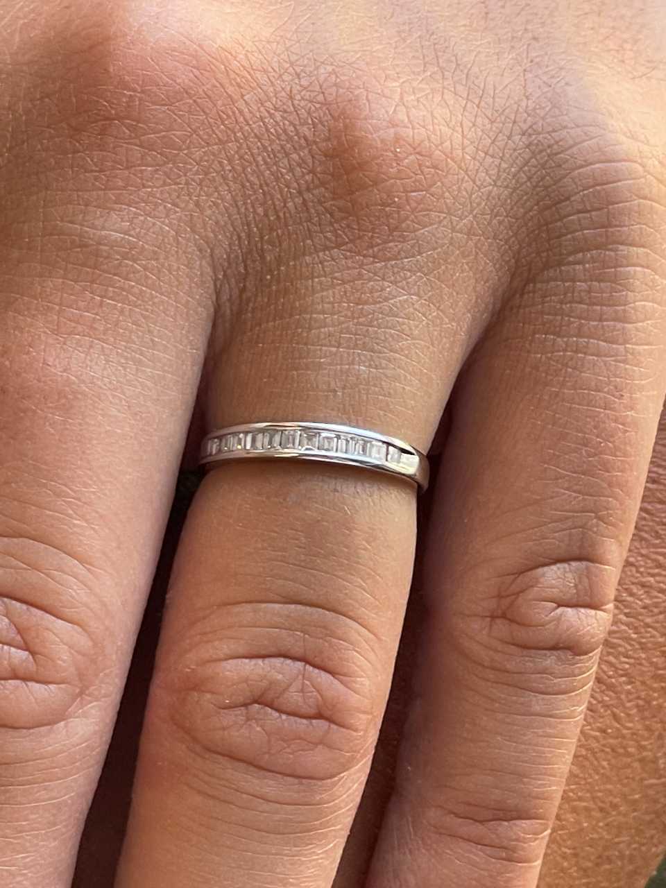 PULASAN, preciosa alianza de diamantes talla baguettes engastadas en forma clásica de galería. Esta realizada en oro blanco de 18 kilates.