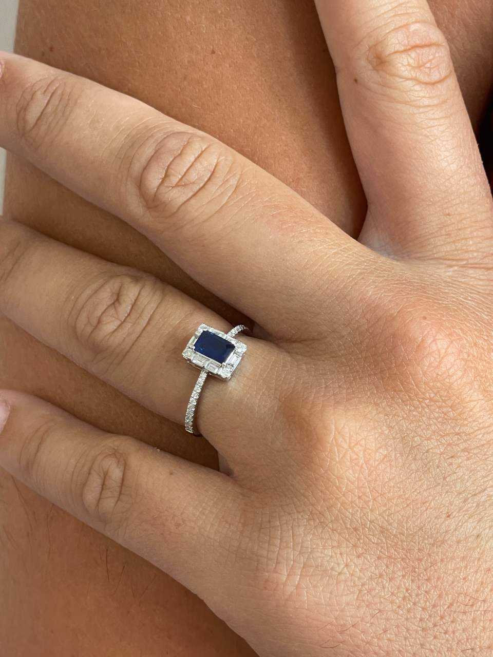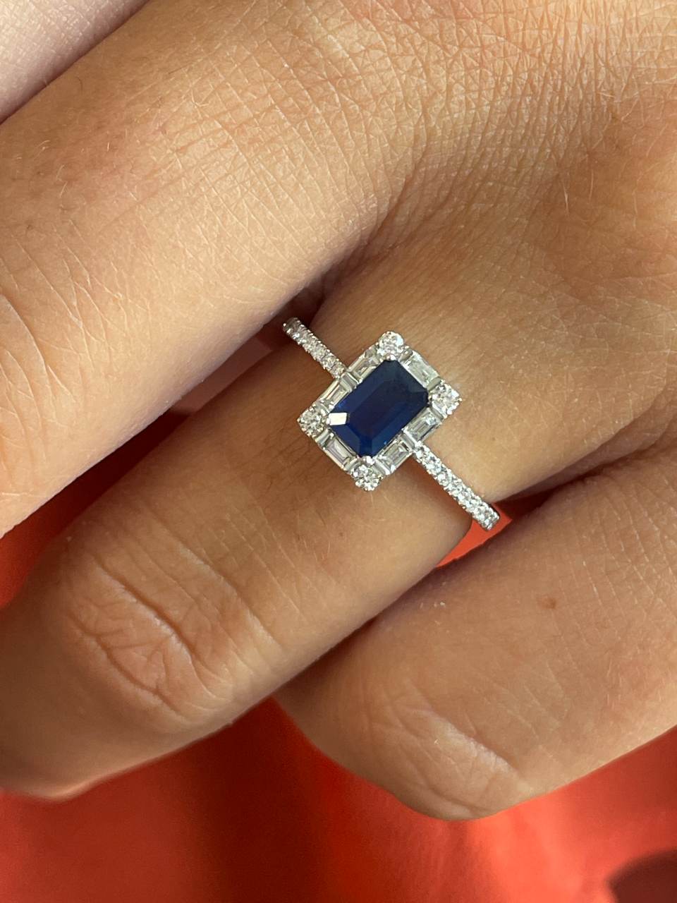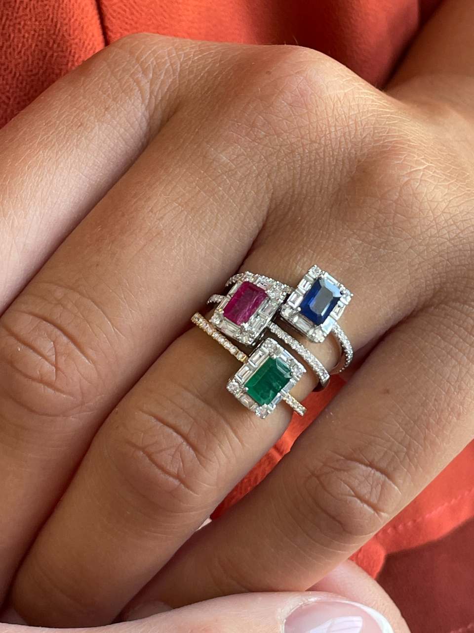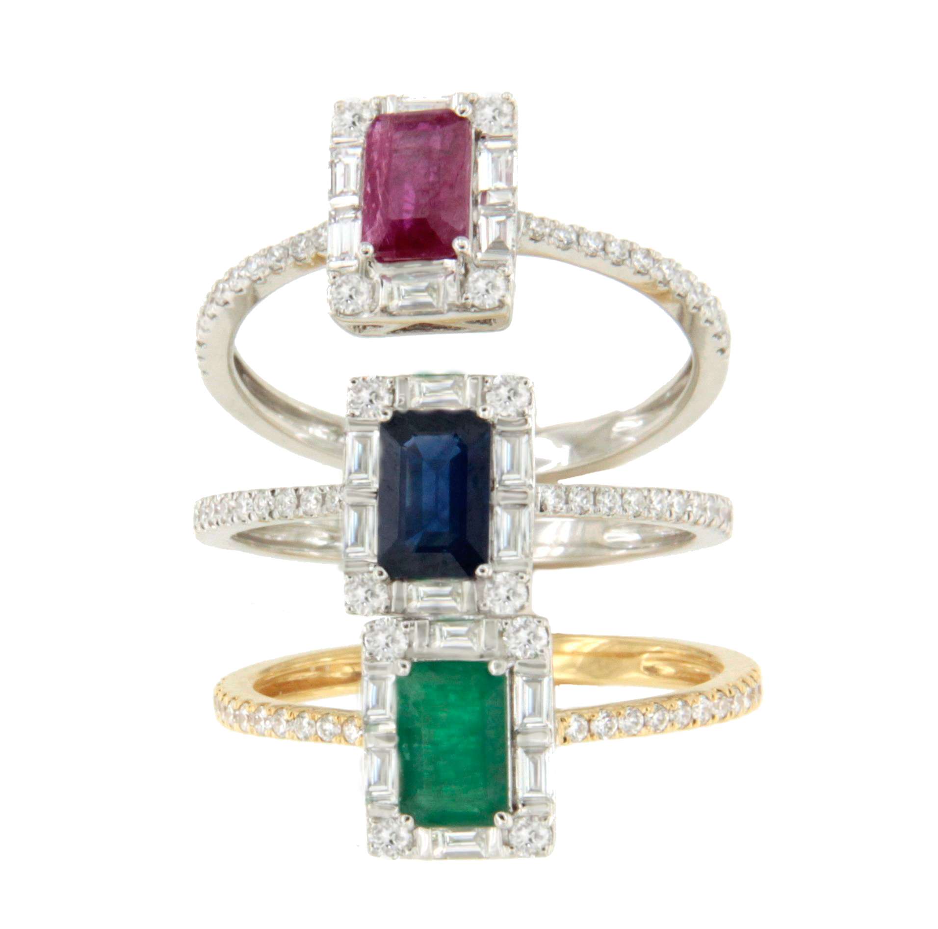 TAMARINDO, es un anillo precioso, con un centro en esmeralda, rubie o zafiro en talla esmeralda y diamantes talla baguettes con brillantes en el brazo . Está realizada en oro blanco o amarillo de 18 kilates.