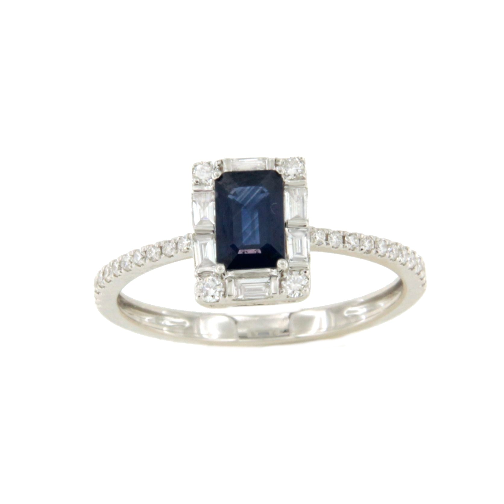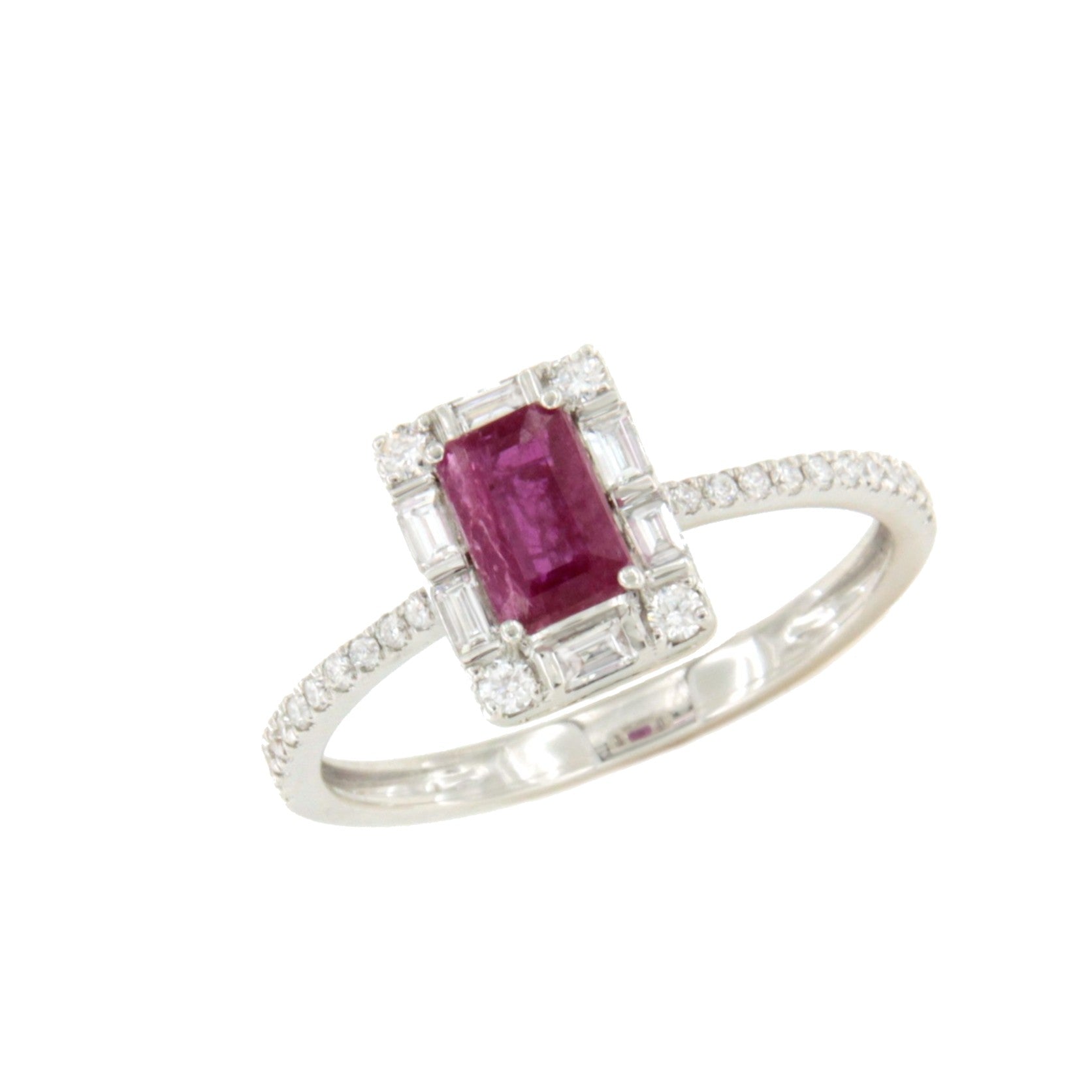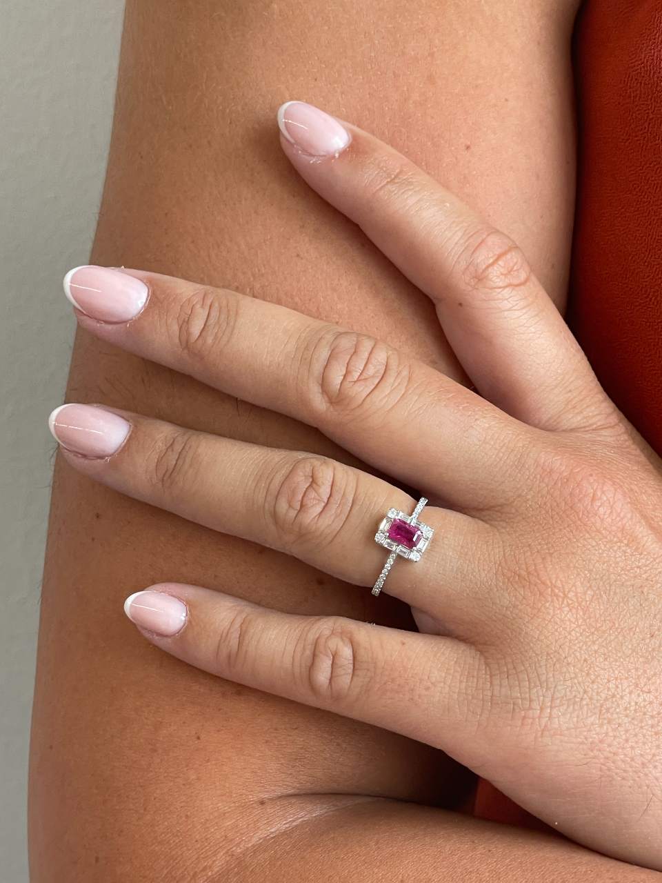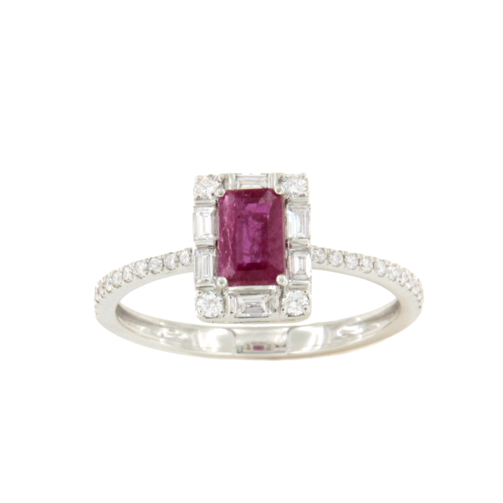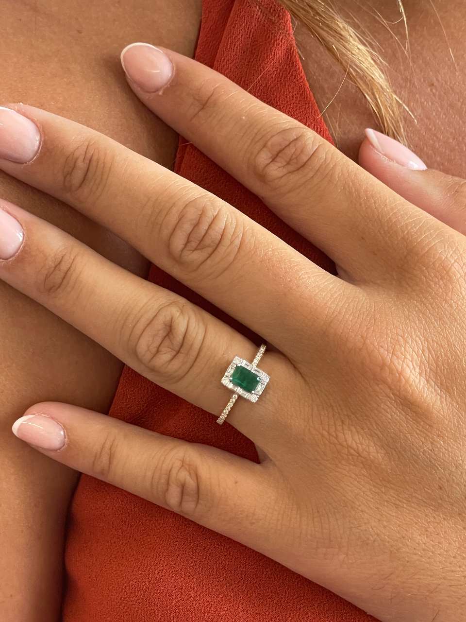 TAMARINDO, es un anillo precioso, con un centro en esmeralda, rubie o zafiro en talla esmeralda y diamantes talla baguettes con brillantes en el brazo . Está realizada en oro blanco o amarillo de 18 kilates.