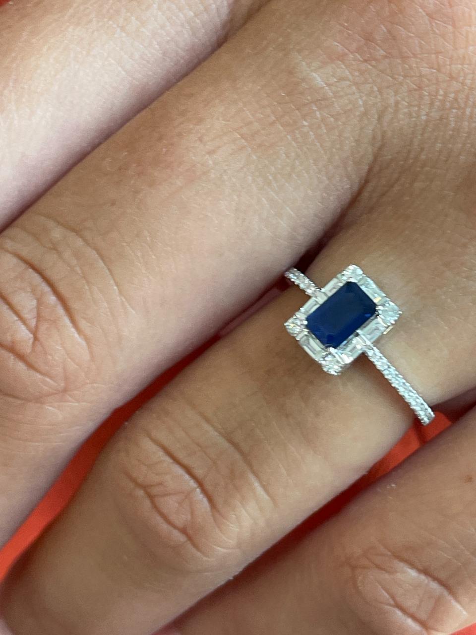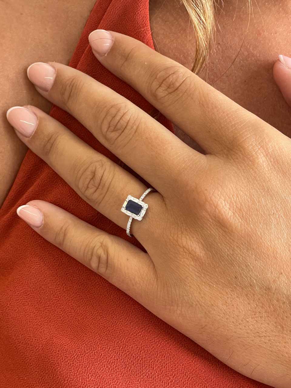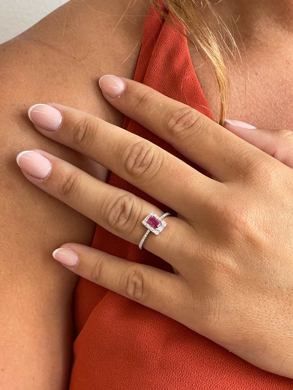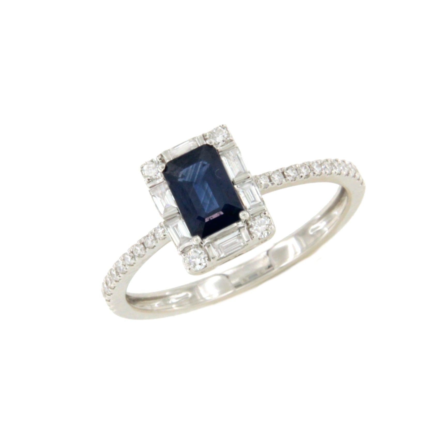 TAMARINDO, es un anillo precioso, con un centro en esmeralda, rubie o zafiro en talla esmeralda y diamantes talla baguettes con brillantes en el brazo . Está realizada en oro blanco o amarillo de 18 kilates.