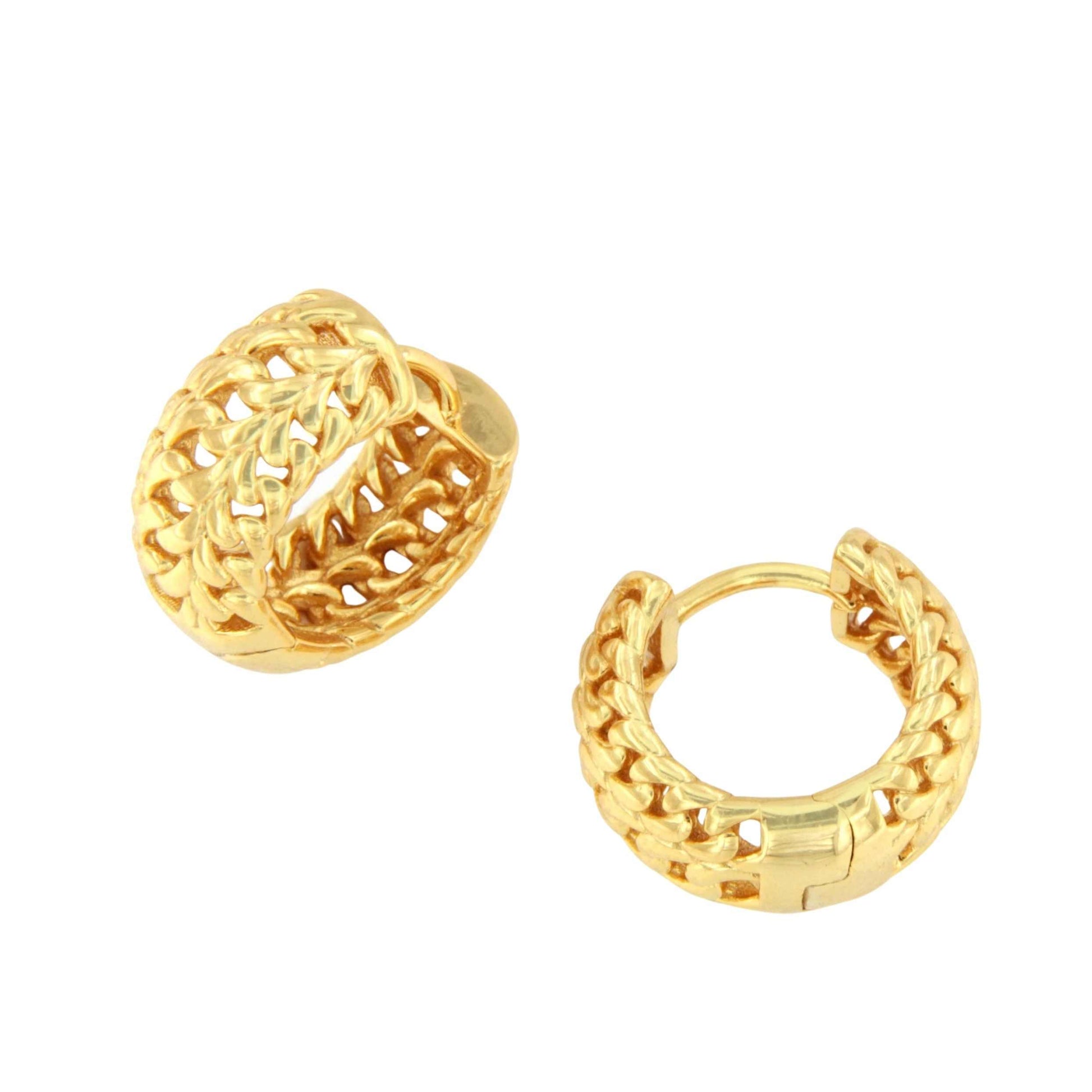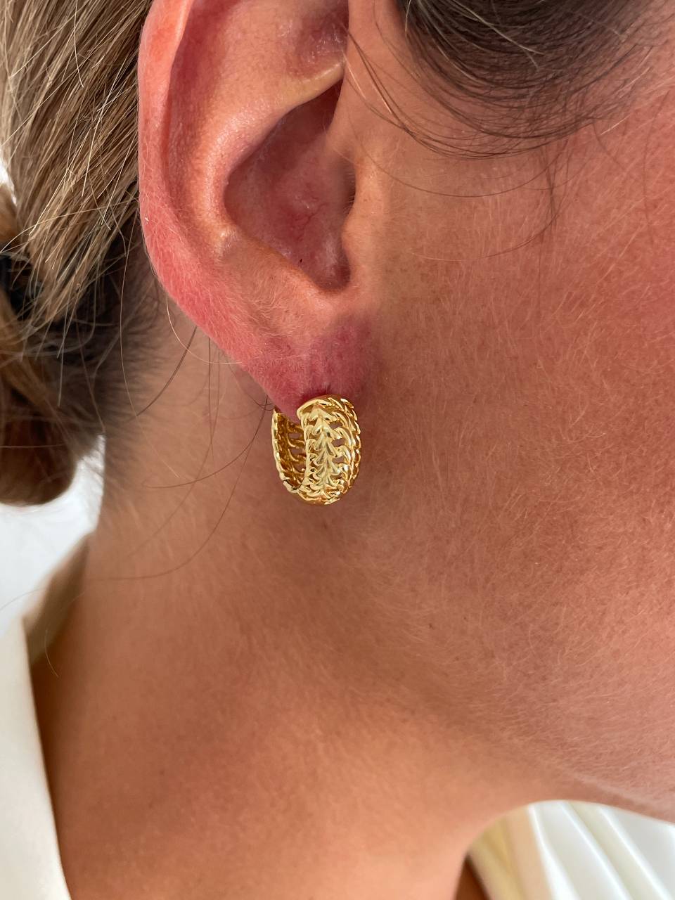 MUSTIQUE son unas argollas muy pequeñas y anchas, realizada en plata de primera ley, con baño de oro amarillo de 18 kilates, su diseño está entrelazado las hacen perfectas para diario . Una pieza imprescindible en tu joyero.