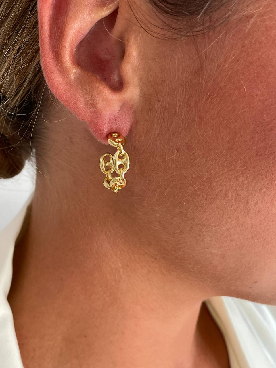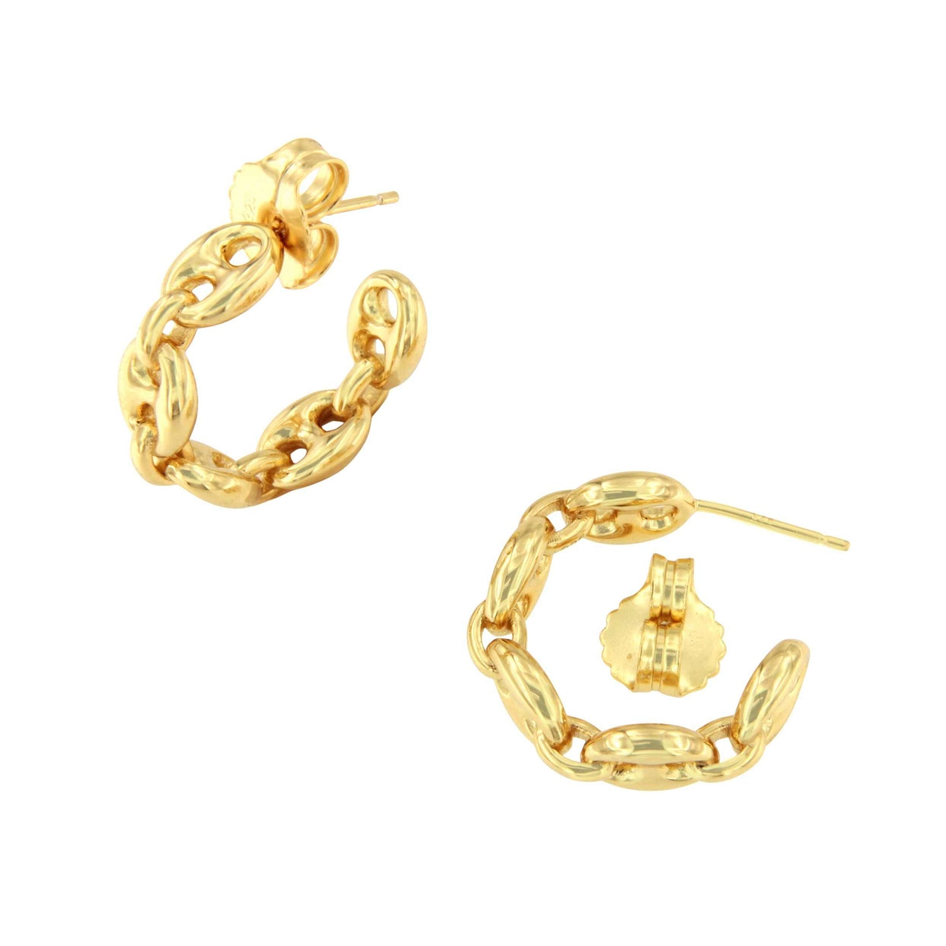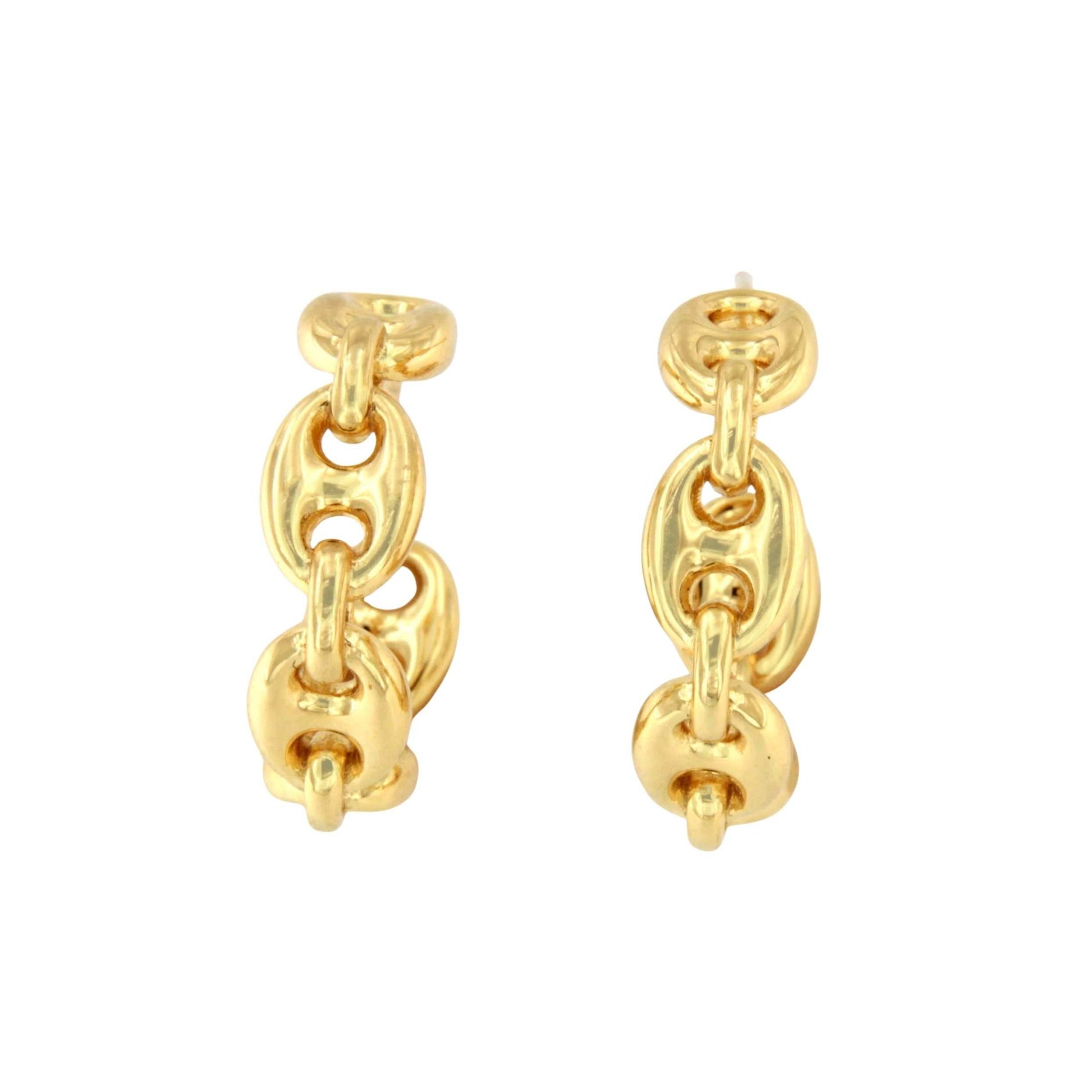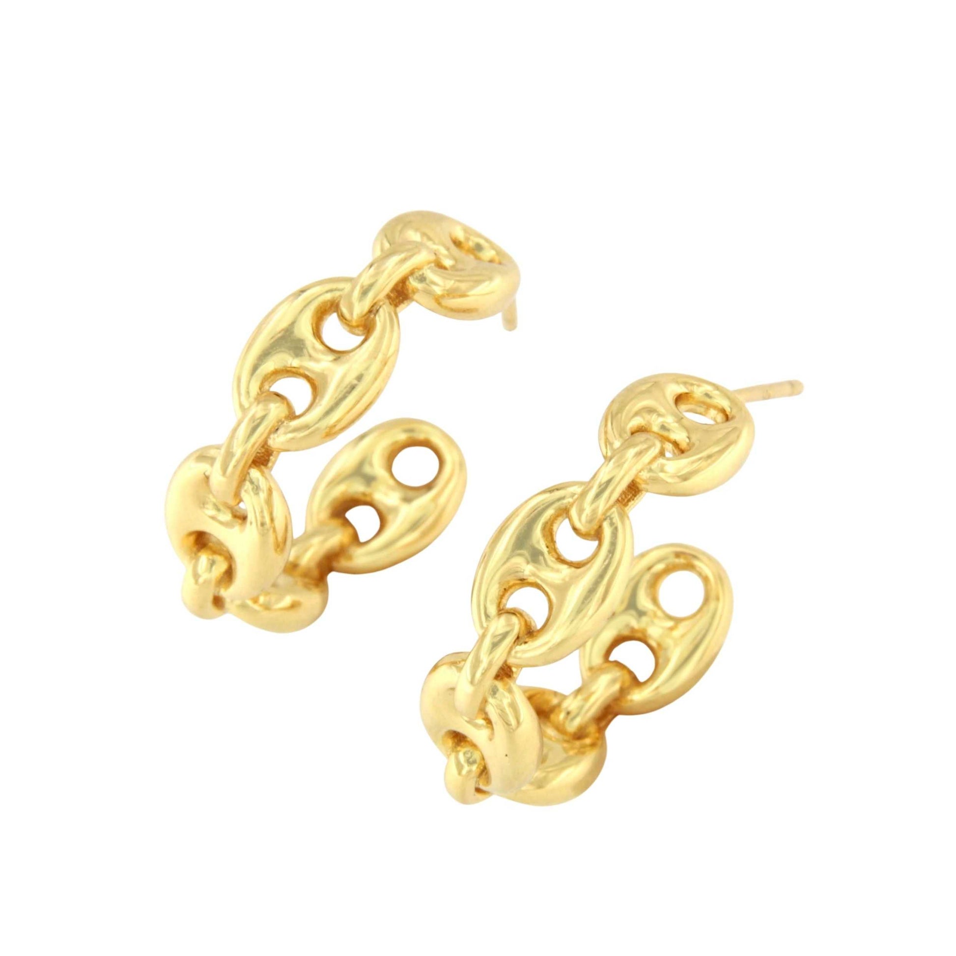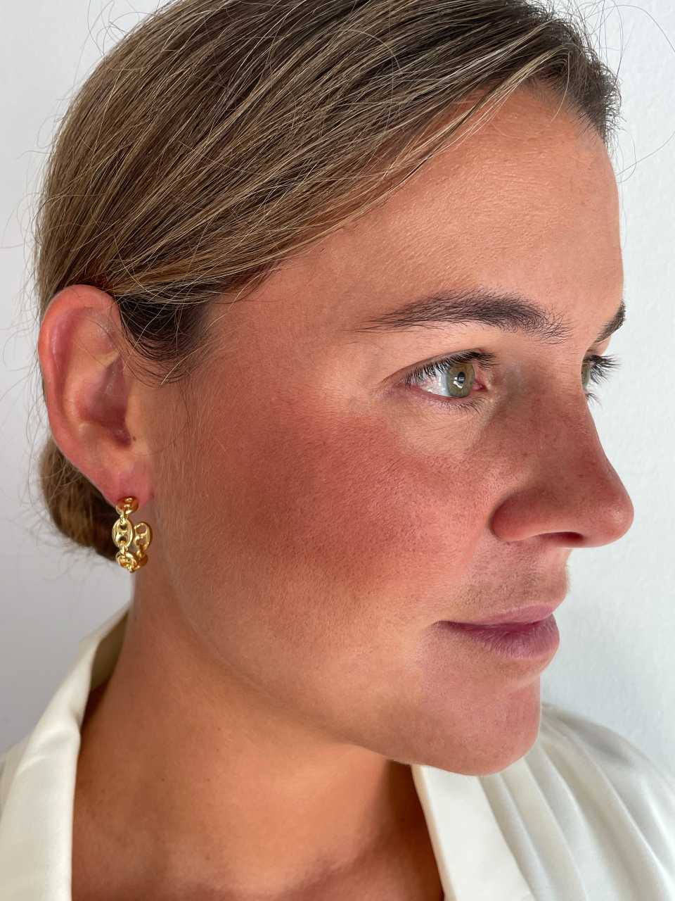 SAINTES son unas argollas muy ligeras, realizada en plata de primera ley, con baño de oro amarillo de 18 kilates, su diseño está compuesto por eslabones nudo de barco que las hacen perfectas para diario . Una pieza imprescindible para tu joyero.