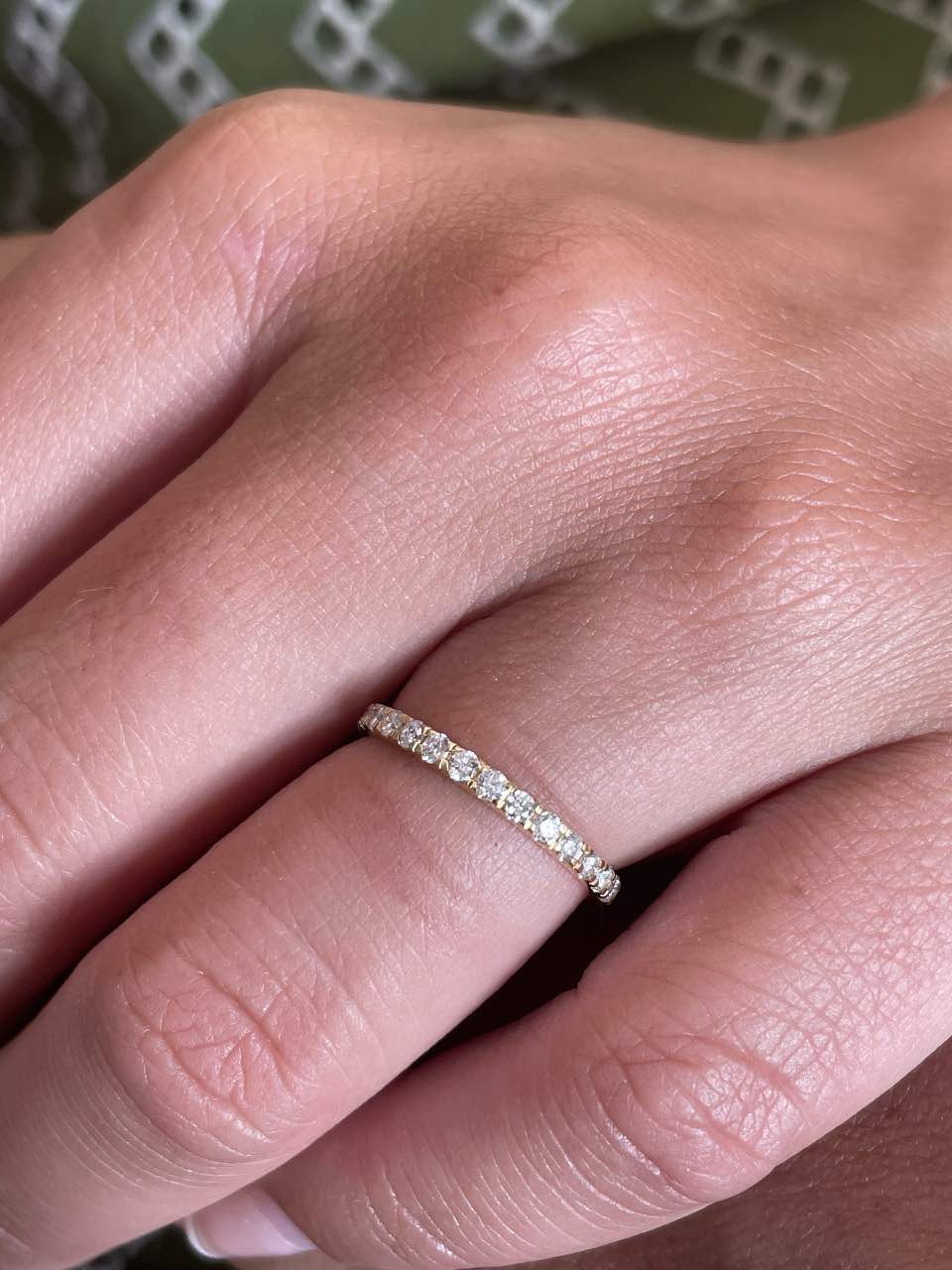 CHOCO, es una alianza clásica de oro amarillo de 18 kilates de 15 diamantes talla brillantes, engastados en garras, también disponibles en oro blanco. Ideal como complemento de anillos con centro como se puede apreciar en alguna foto.