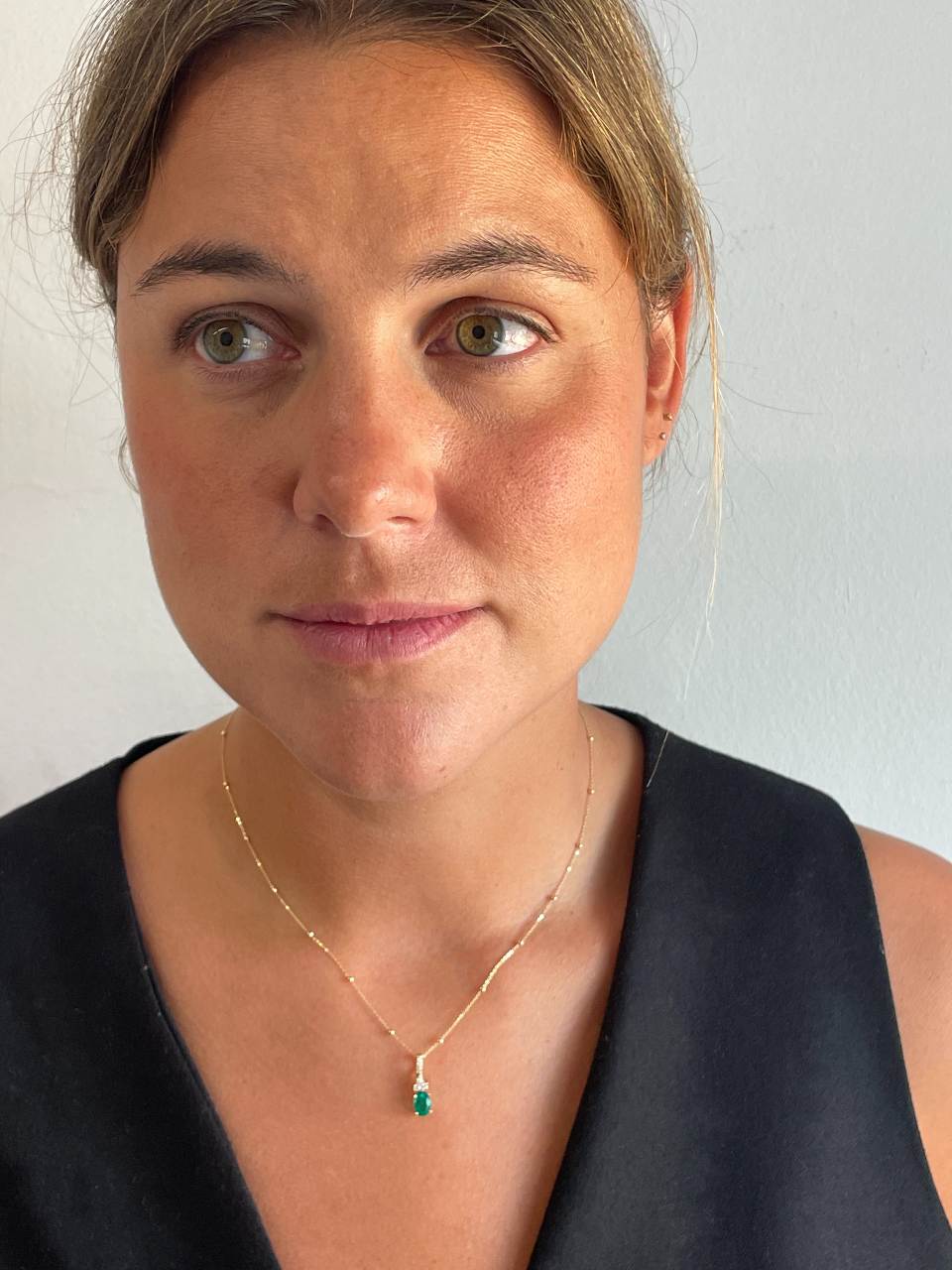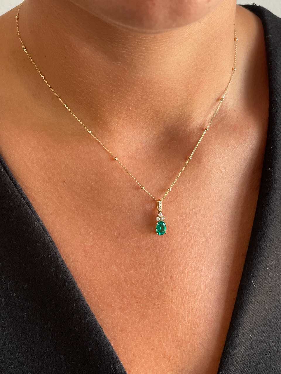 CHESTER, es un colgante, realizada en oro amarillo de 18 ktes, el colgante lleva una esmeralda oval central que cuelga de un asa con tres brillantes en pico. Cadenita no incluida en el precio.