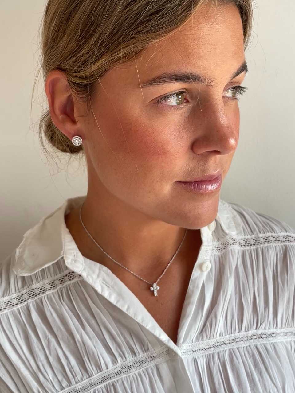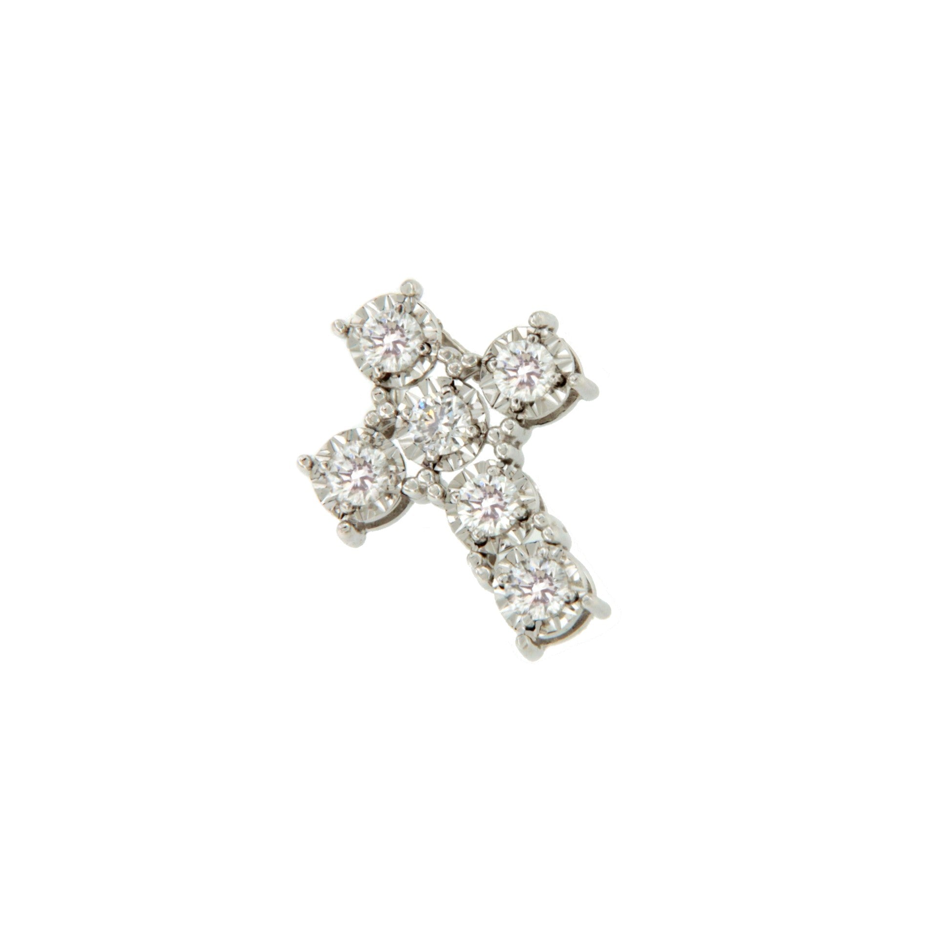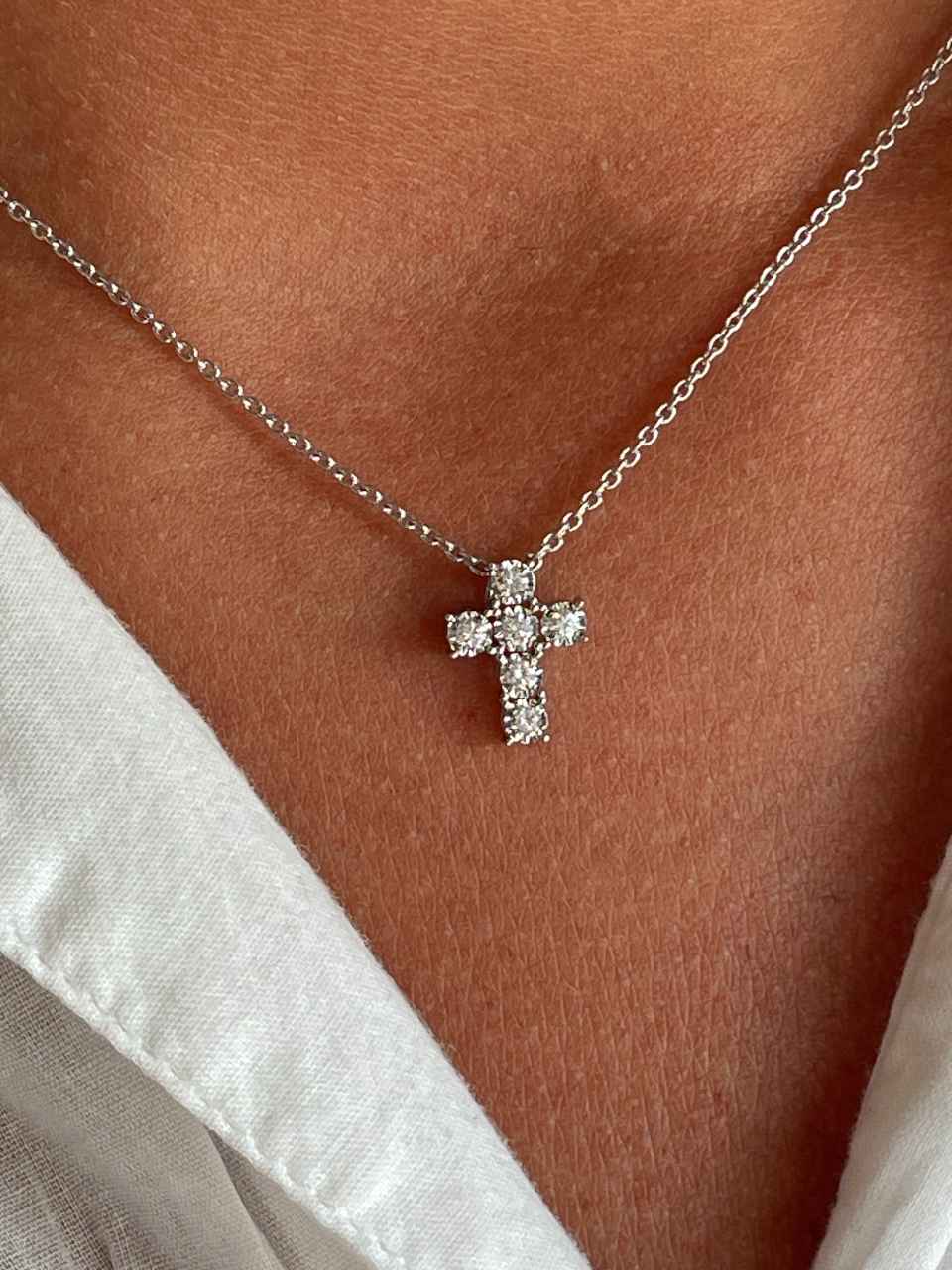 BASILEA, es una cruz pequeña muy elegante realizada en oro blanco de 18 kilates. Su diseño elegante y clásico con brillantes sobre una base adiamantada.