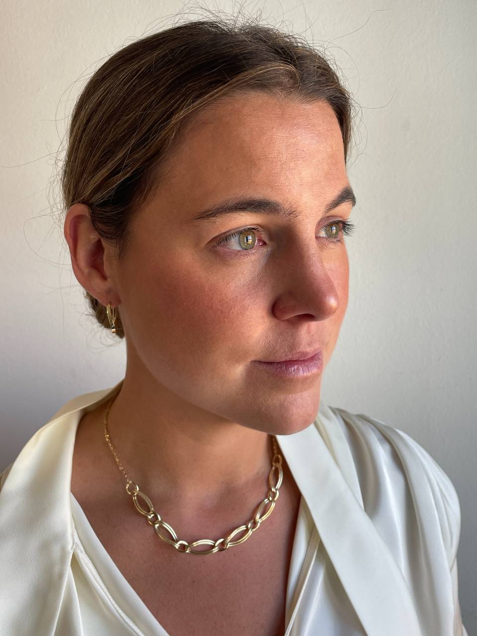 DAKOTA, es una gargantilla muy ligera con un centro tipo pulsera, está realizada en oro amarillo de 18 kilates con trozo de eslabones barbados doble de distinto tamaño que termina en cadena fina doble.