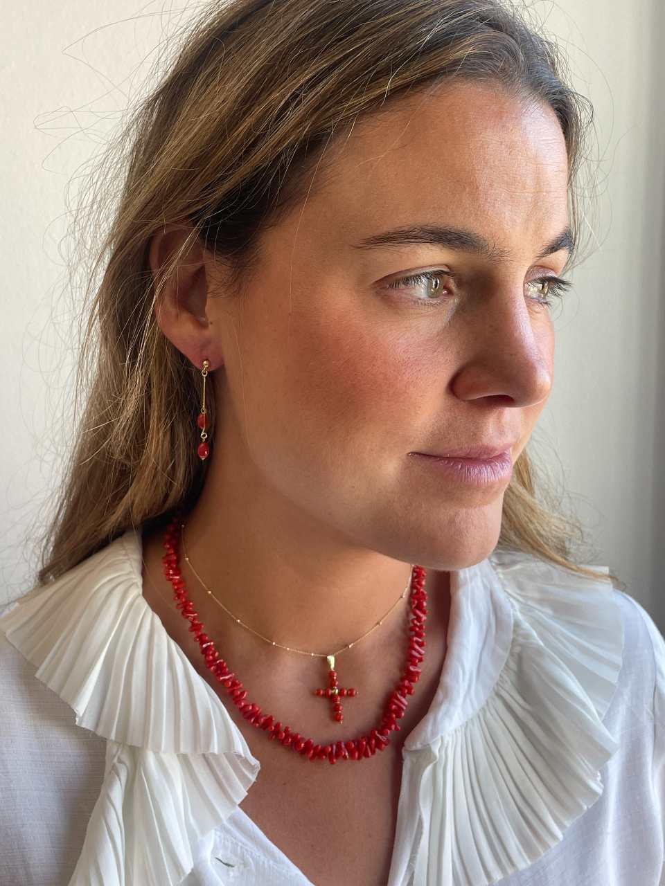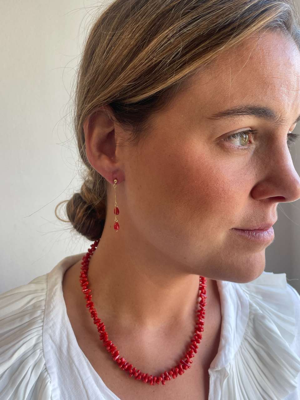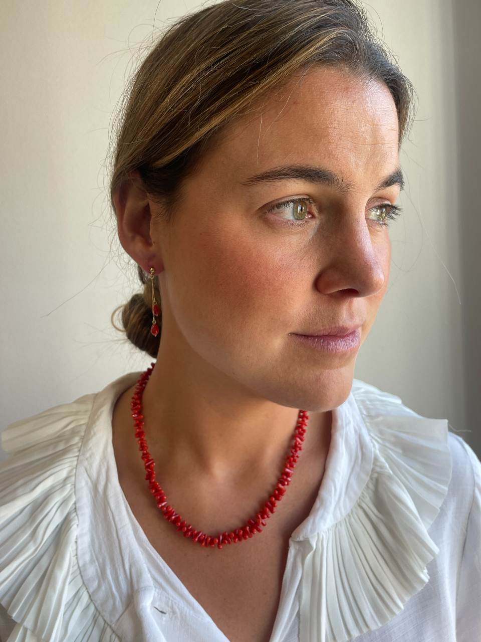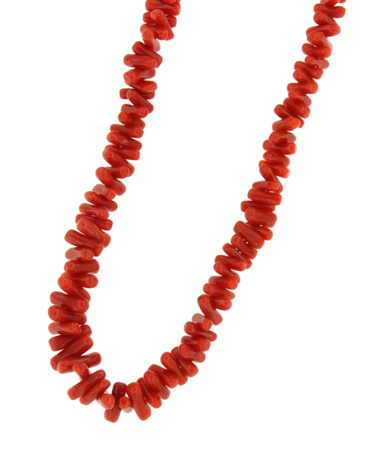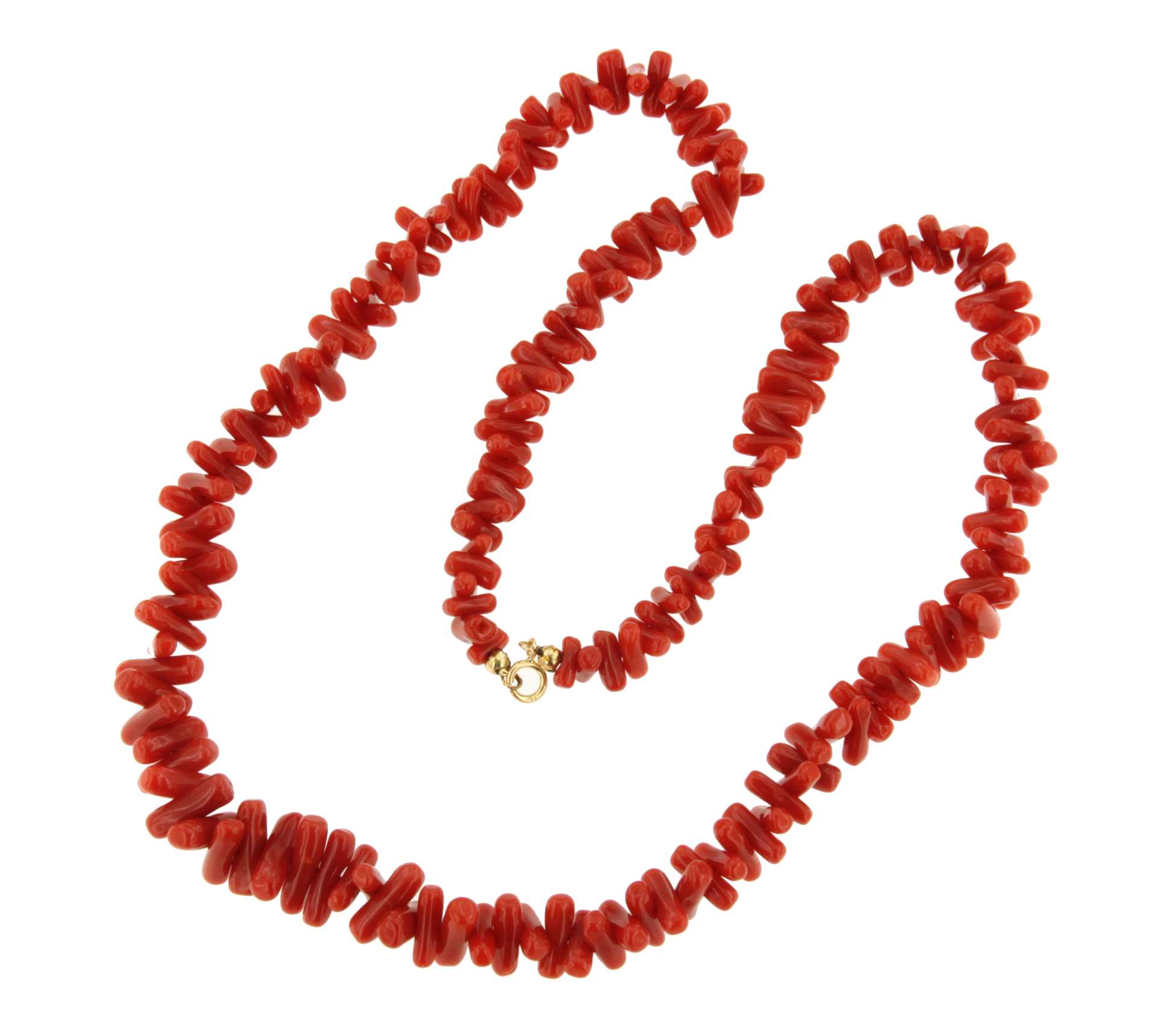 BAMBU, es una preciosa gargantilla tipo collar de coral, con corales pequeños en rama o palitos engarzados en disminución a lo largo con un cierre de oro amarillo de 18 kilates.
