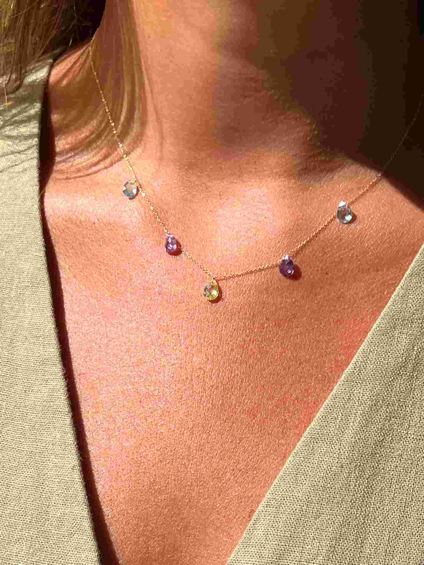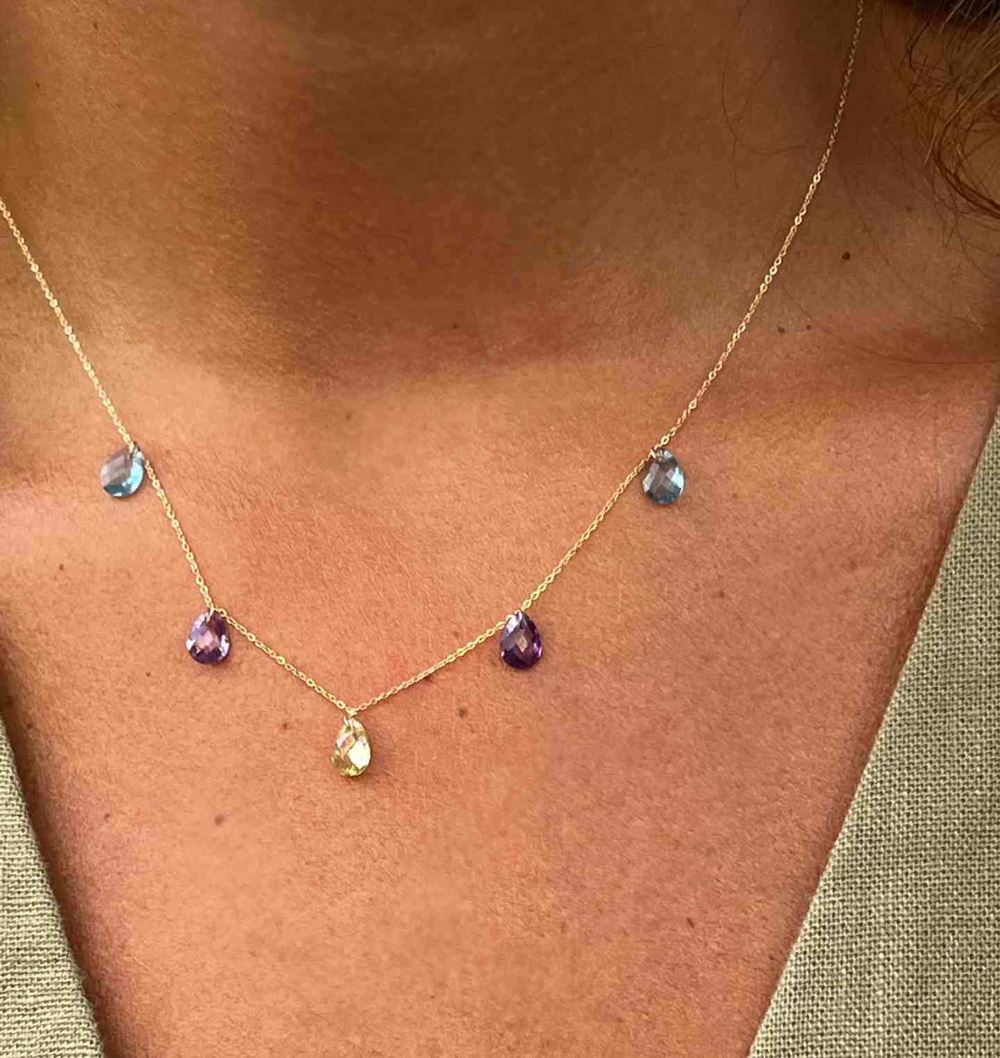 La actualidad en BURCU no pasa desapercibida por su colorido. Es una gargantilla formada por una cadena forzada clásica de la que cuelgan 5 piñones, con forma de pera, de cuarzos planos facetados en distintos colores.