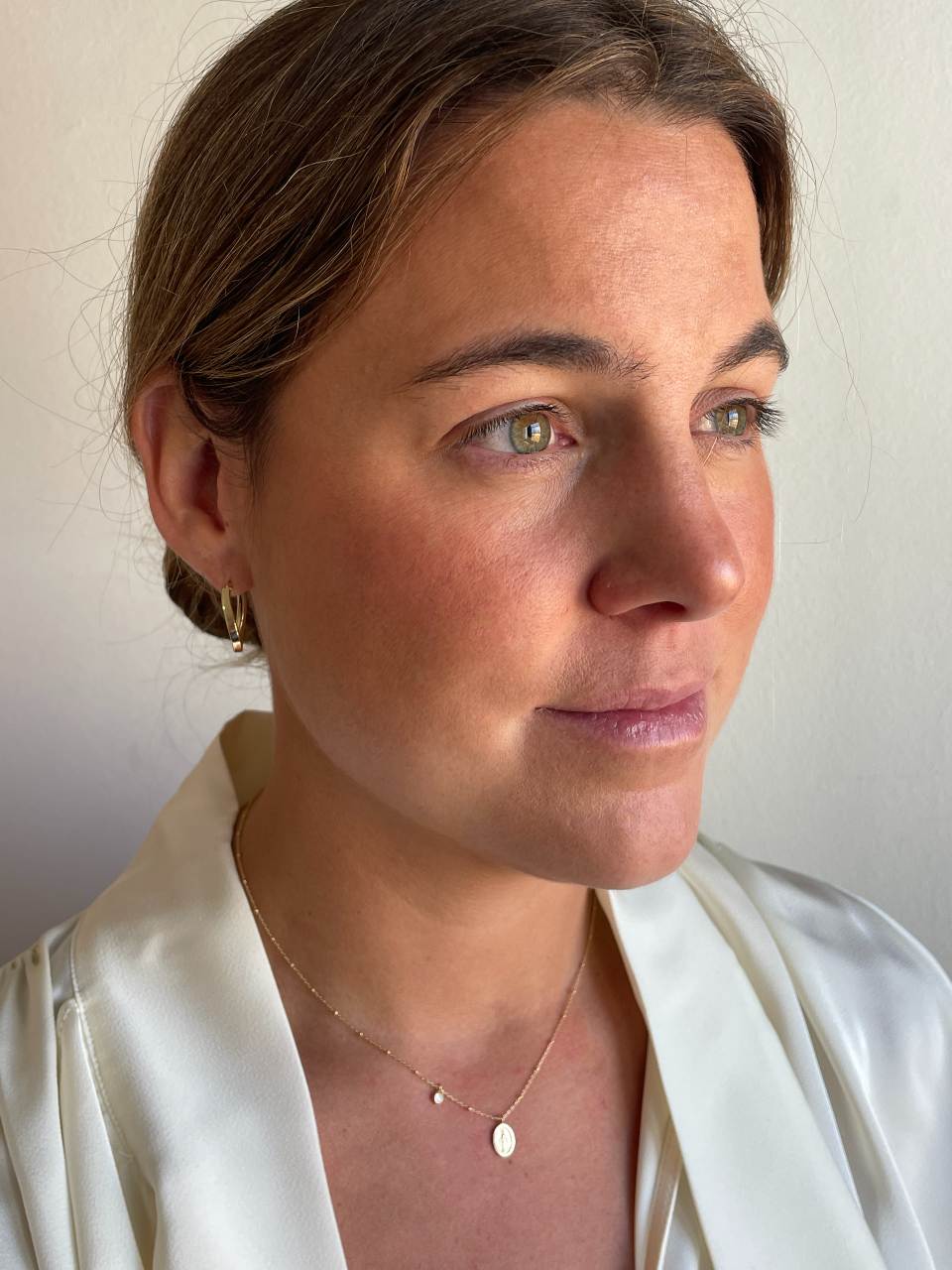 OREGON, es una cadena de la que cuelga una medalla de Virgen Milagrosa, con un detalle de circonita. Está realizado en oro amarillo de 18 kilates.