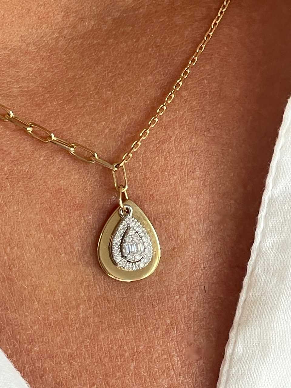 TAMARIN, es una cadena mixta de la que cuelga un colgante en forma de pera, con un centro de roseta de brillantes y baguettes sobre chapa lisa . Está realizado en oro blanco y amarillo de 18 kilates.