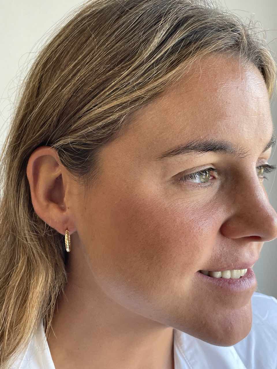 CAMELIA, pequeña argolla o aro con un diseño facetado con brillo realizado en oro amarillo de 18 kilates.