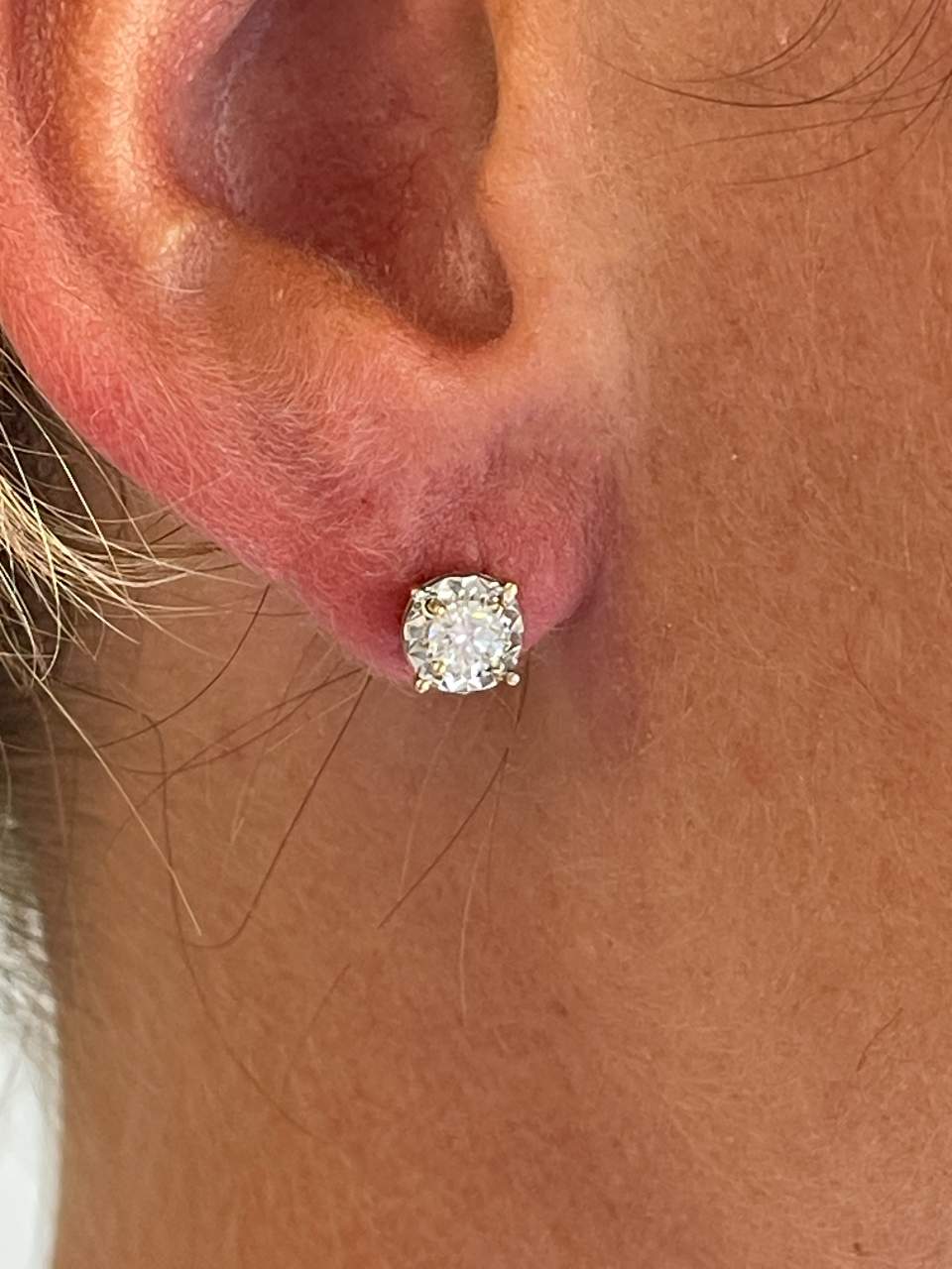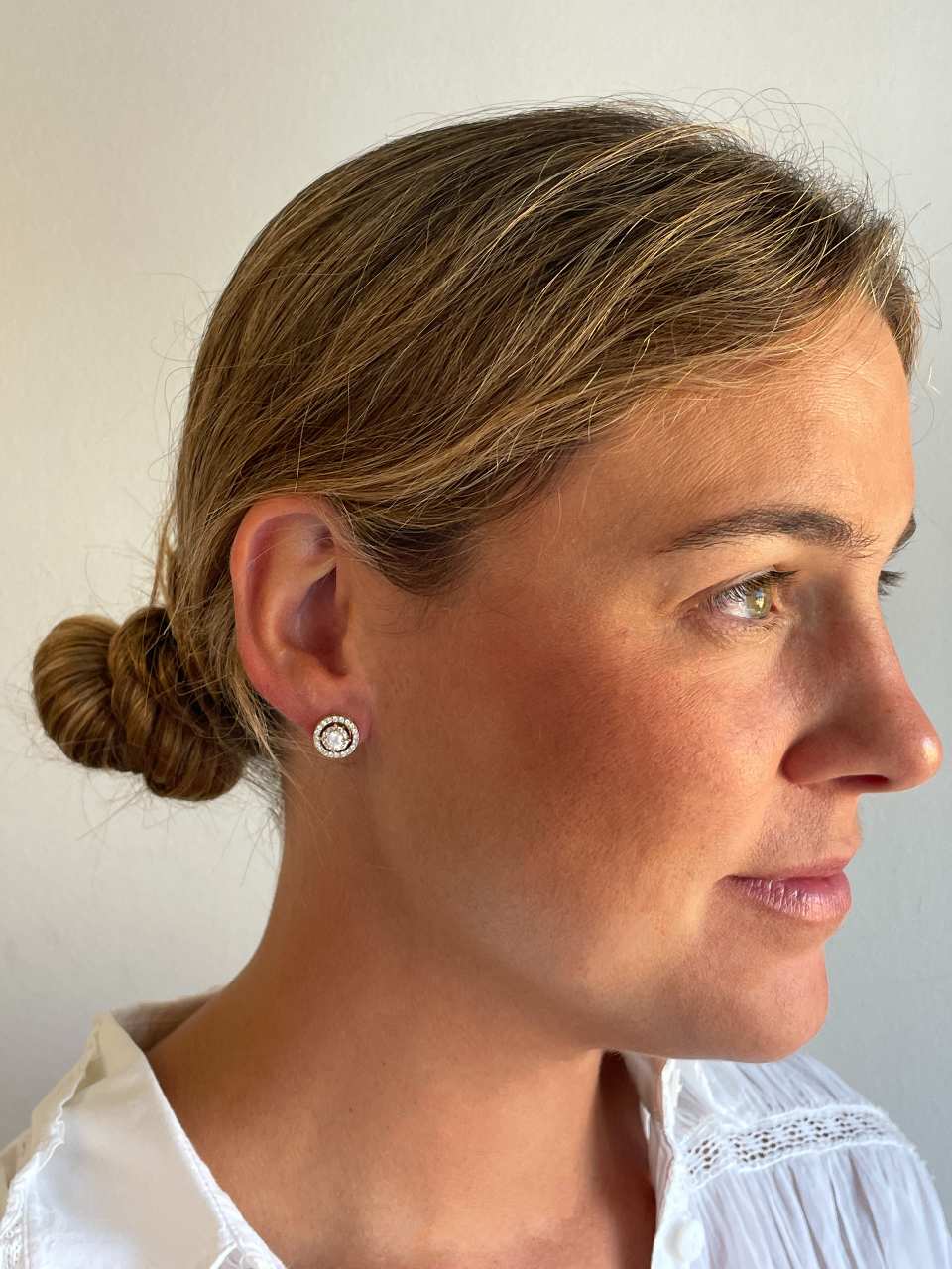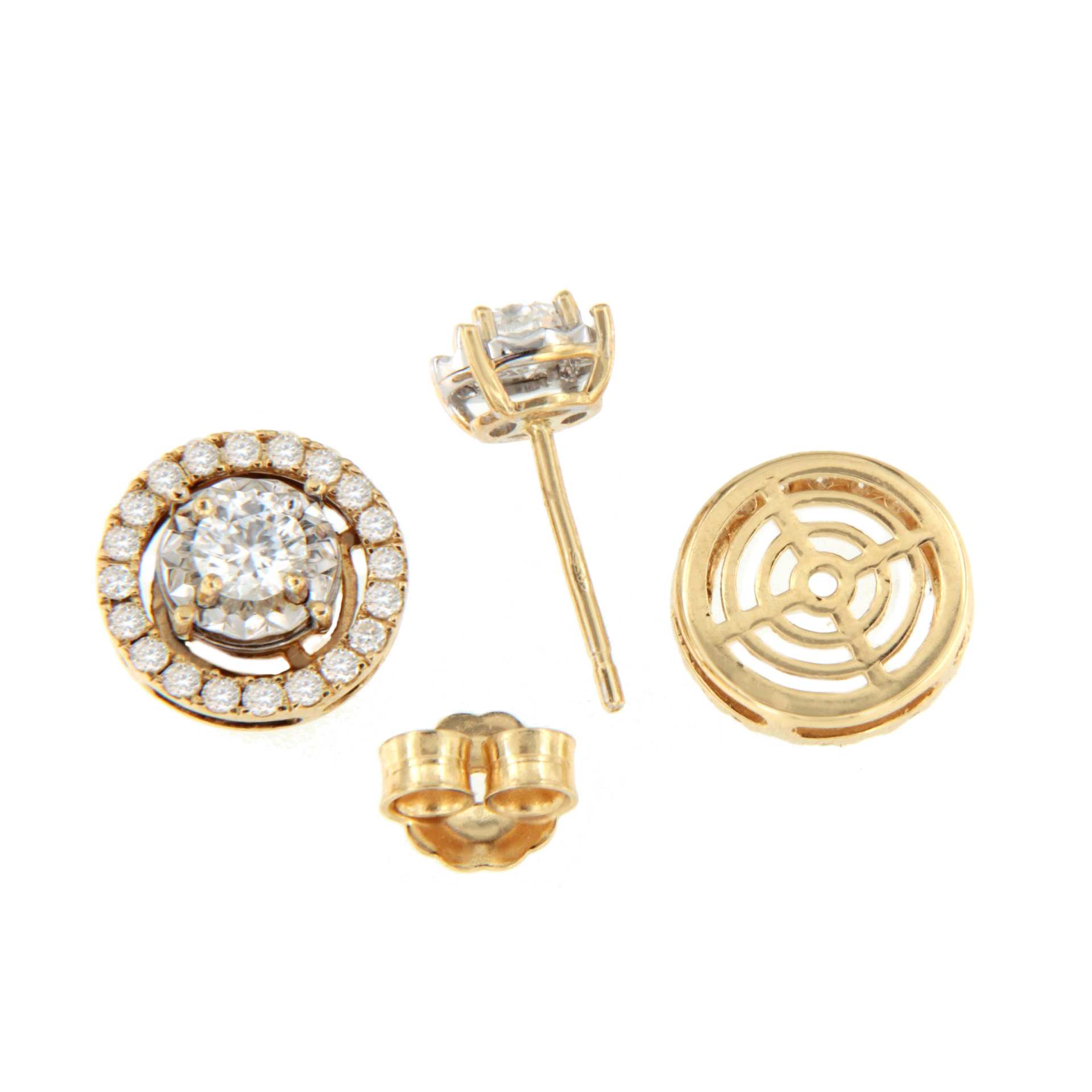 CAPRERA, son unos pendientes desmontables cortos en oro amarillo y blanco de 18 kilates. Su diseño es un solitario de brillantes, sobre una base adiamantada y un disco que lo rodea en brillantes.