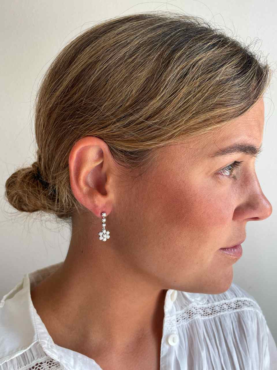 COLONIA, son unos pendientes largos con brillantes que cuelgan, con tres brillantes enlazados y terminando en una roseta de brillante. Están realizados en oro blanco de 18 kilates. ¡Precioso para novias!