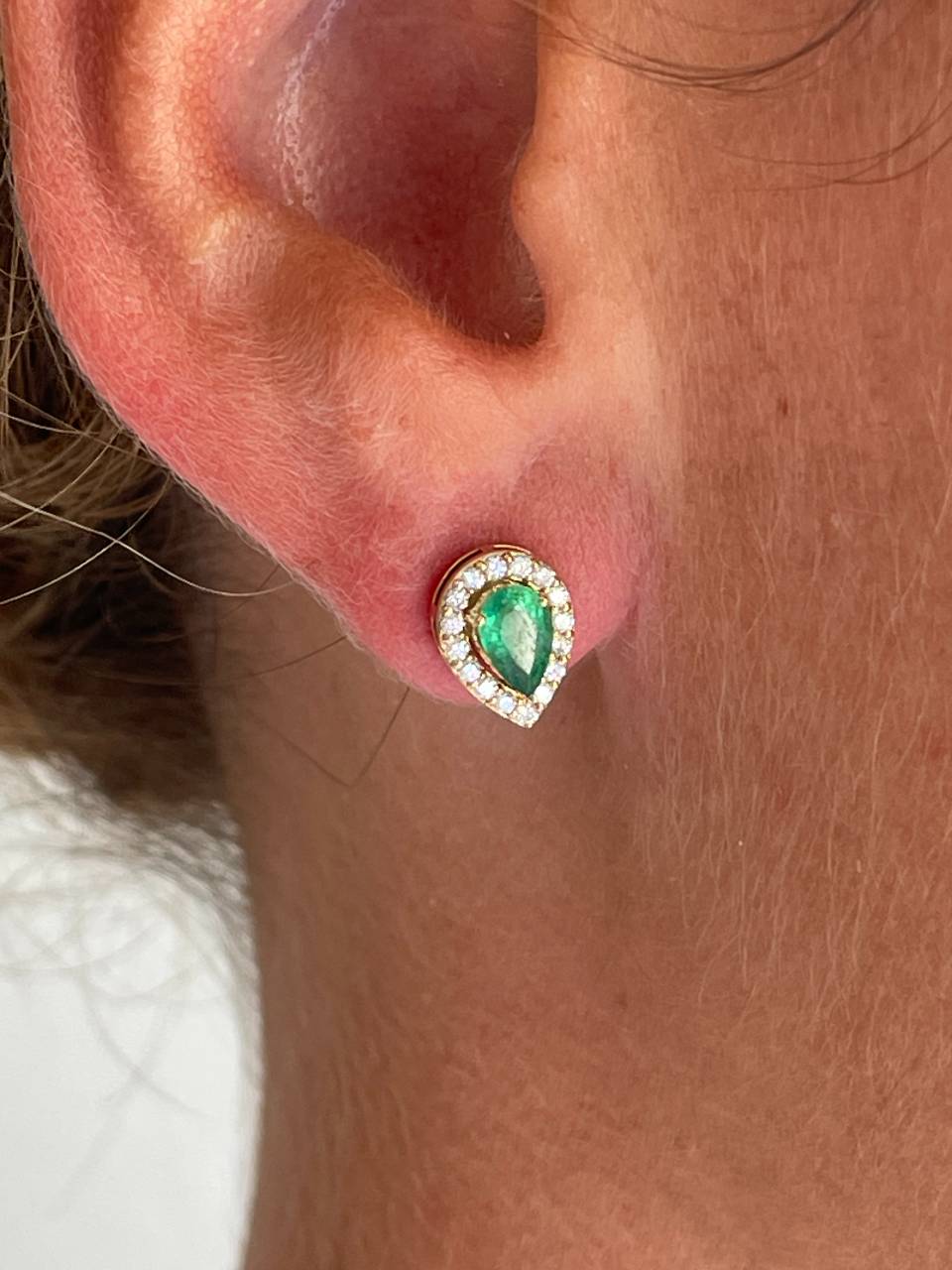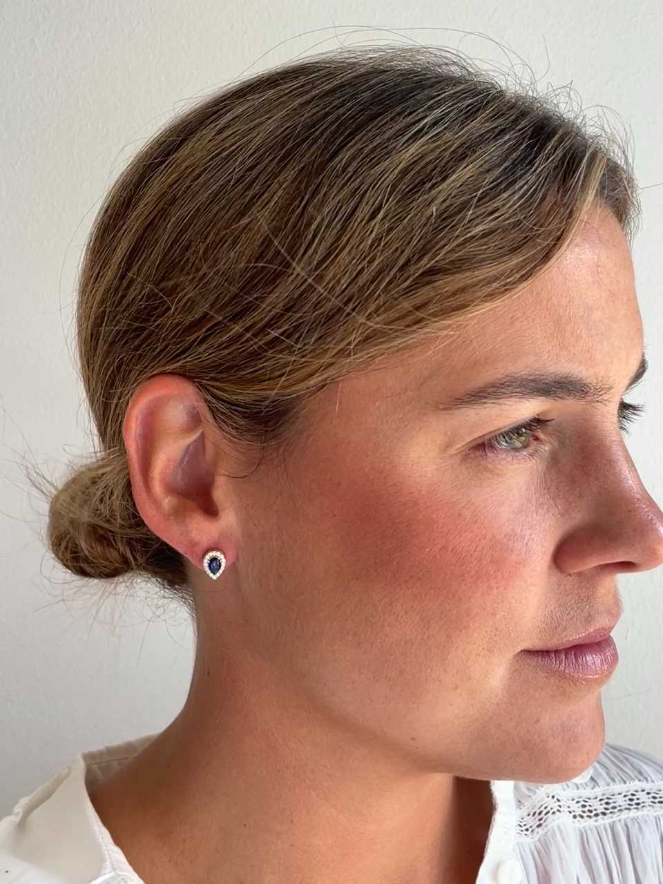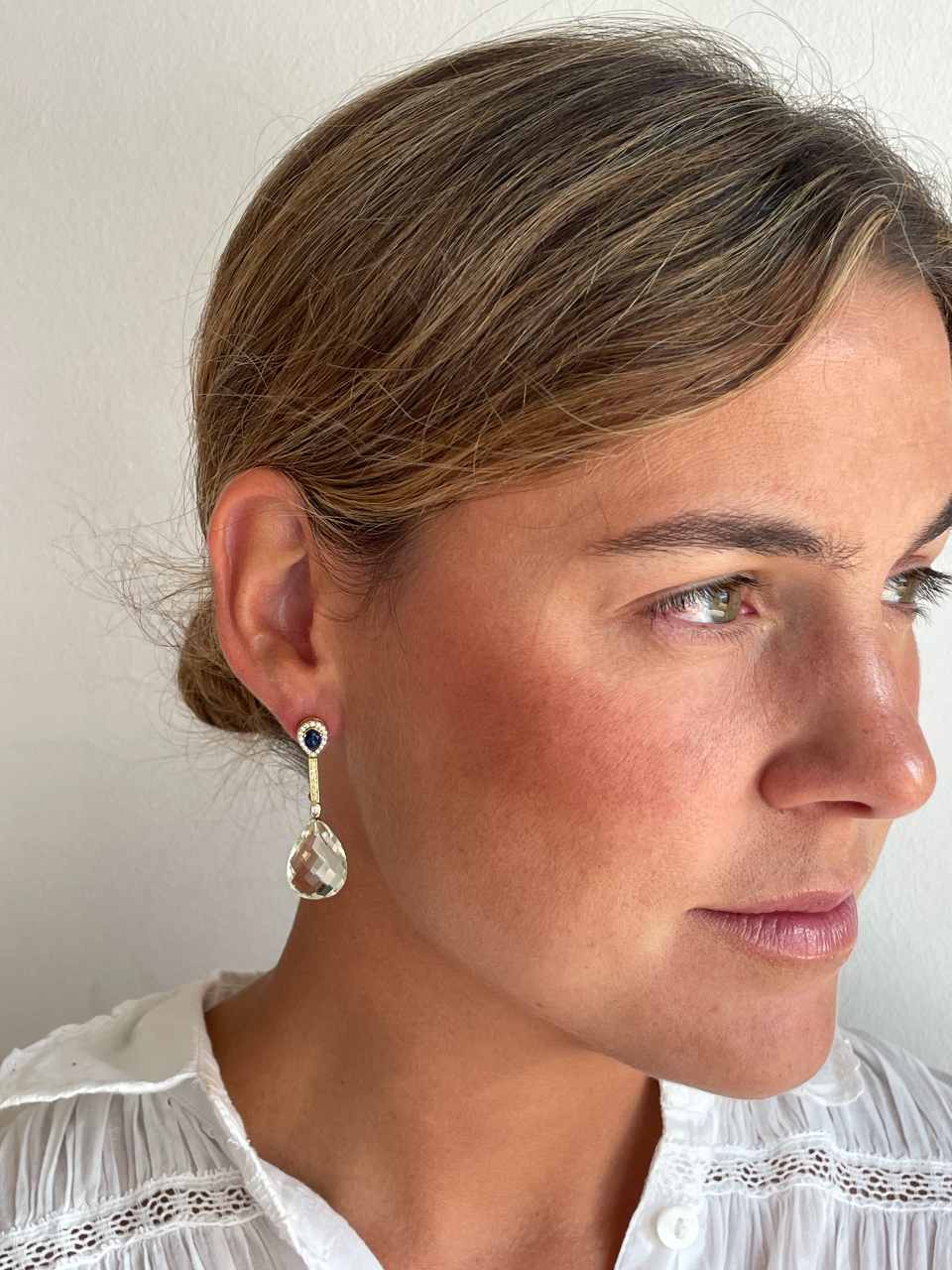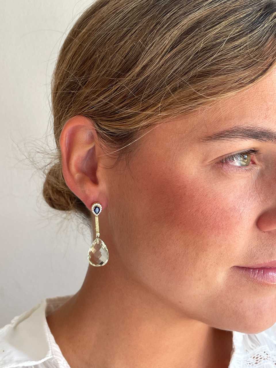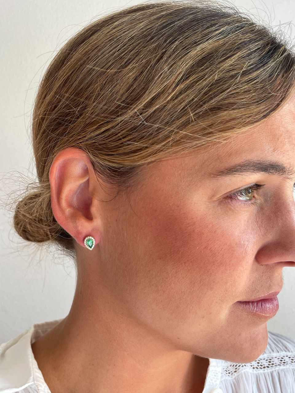 KAZAN, son unos pendientes desmontables cortos en oro amarillo de 18 kilates. Su diseño es una roseta en forma de pera engastado en garras en zafiro o esmeralda, y brillantes. Los puedes lucir cortos o más largos con nuestros accesorios intercambiables, creando combinaciones únicas para cualquier ocasión.