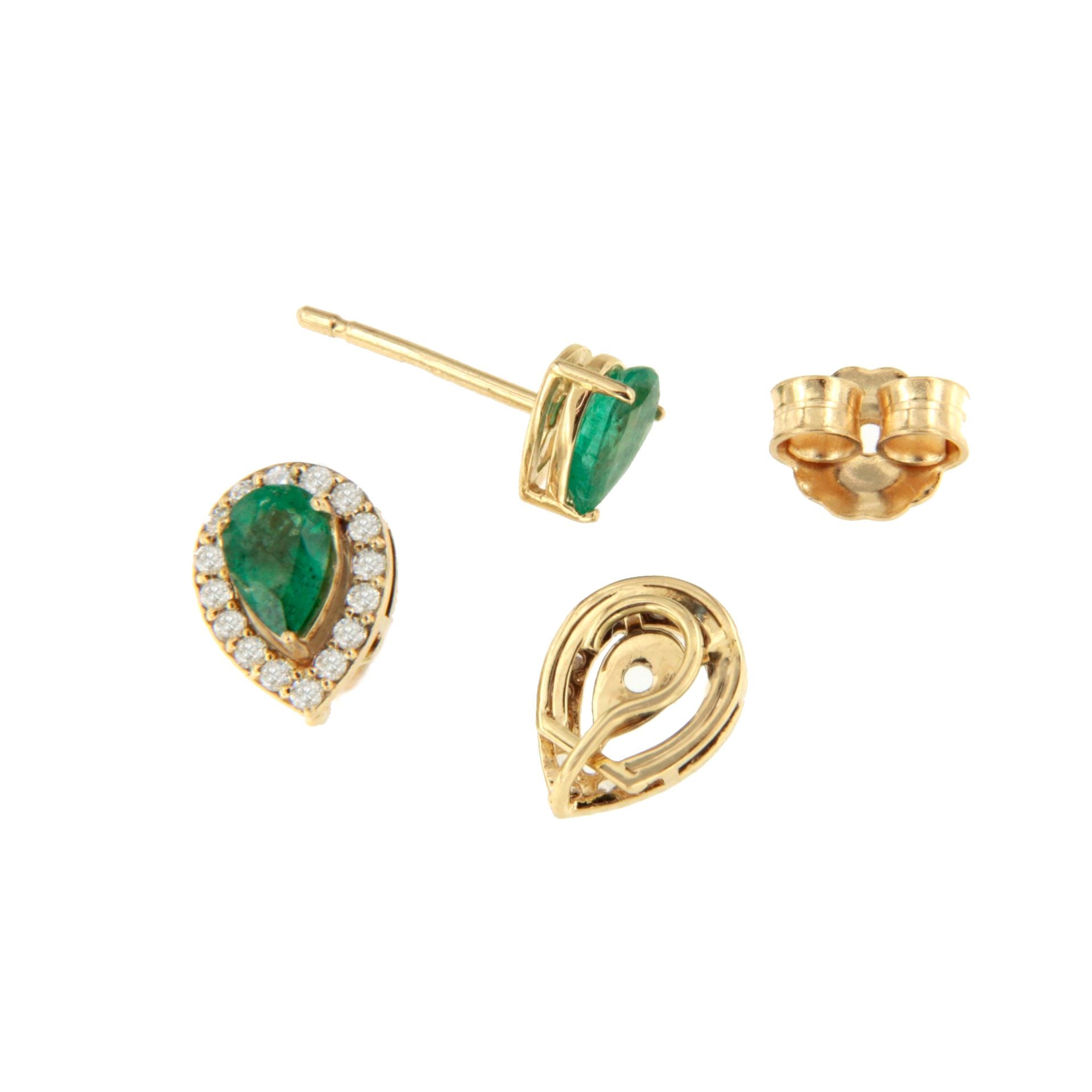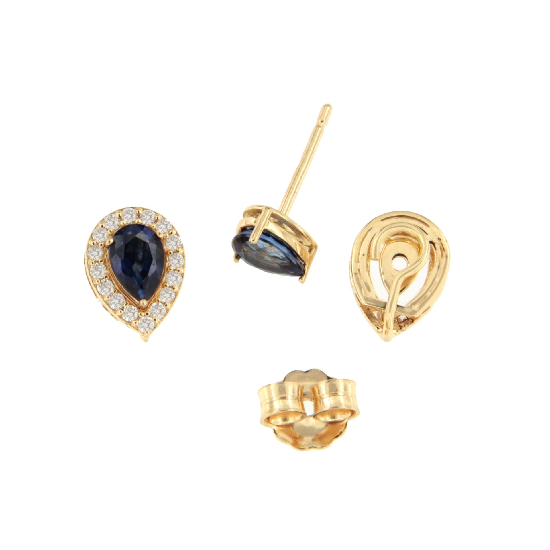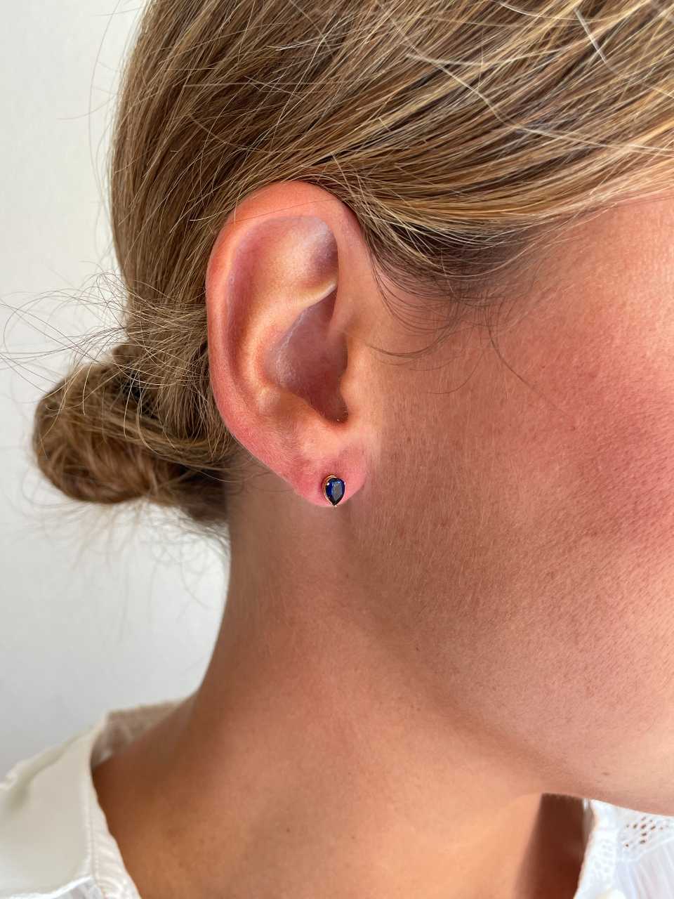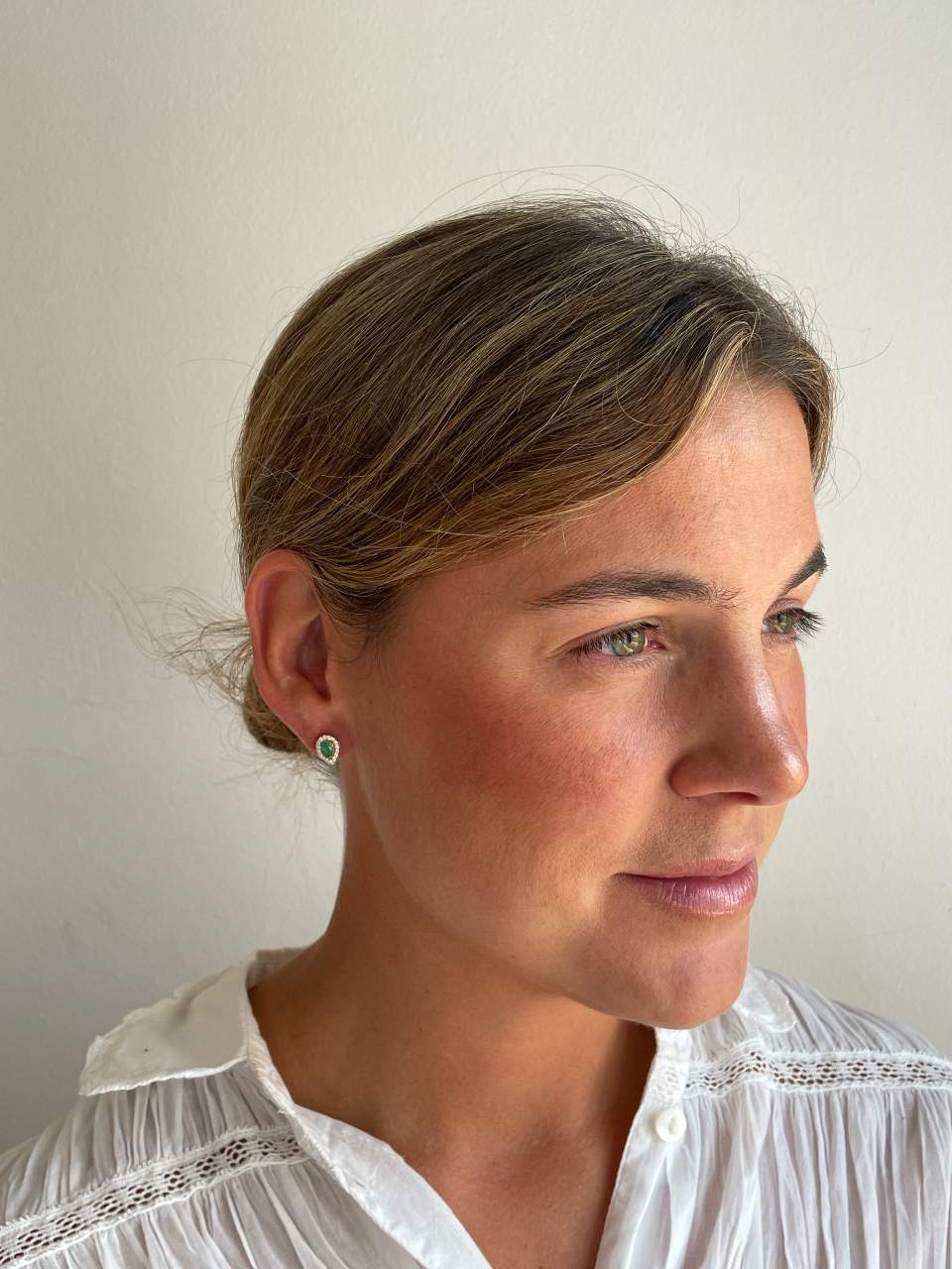 KAZAN, son unos pendientes desmontables cortos en oro amarillo de 18 kilates. Su diseño es una roseta en forma de pera engastado en garras en zafiro o esmeralda, y brillantes. Los puedes lucir cortos o más largos con nuestros accesorios intercambiables, creando combinaciones únicas para cualquier ocasión.