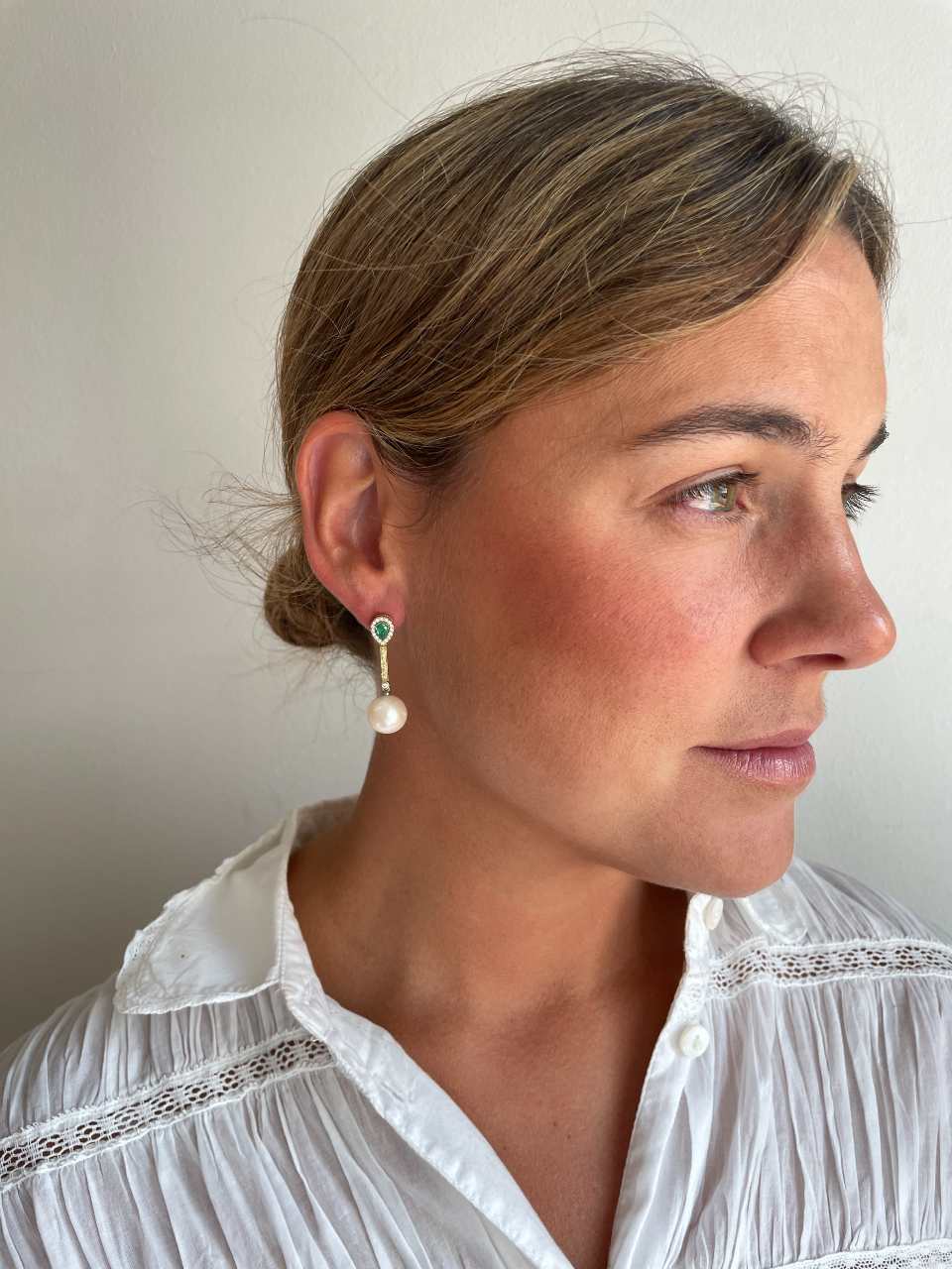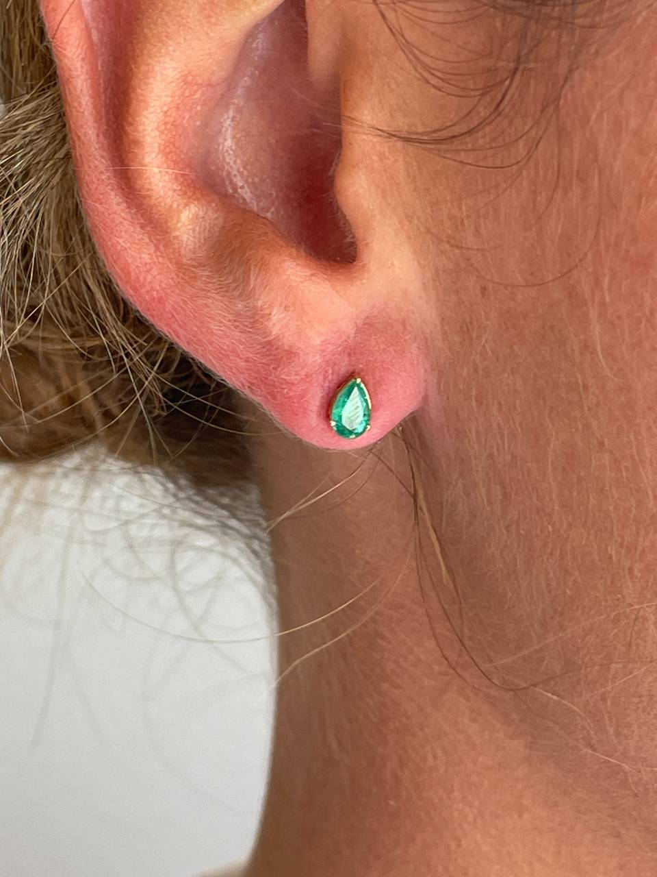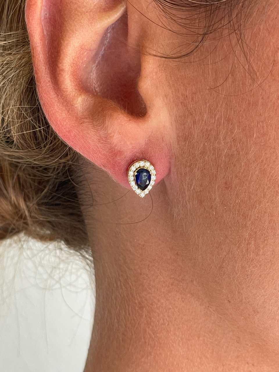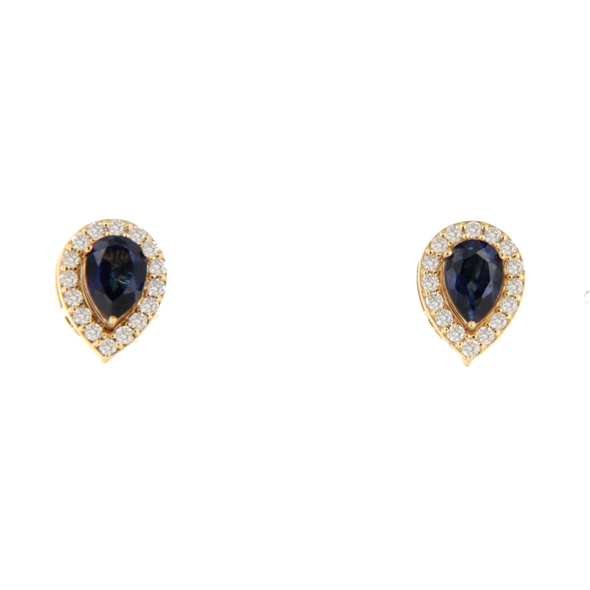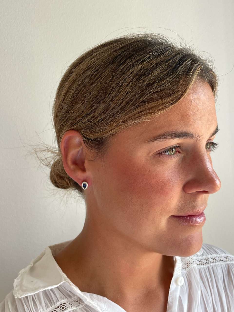 KAZAN, son unos pendientes desmontables cortos en oro amarillo de 18 kilates. Su diseño es una roseta en forma de pera engastado en garras en zafiro o esmeralda, y brillantes. Los puedes lucir cortos o más largos con nuestros accesorios intercambiables, creando combinaciones únicas para cualquier ocasión.