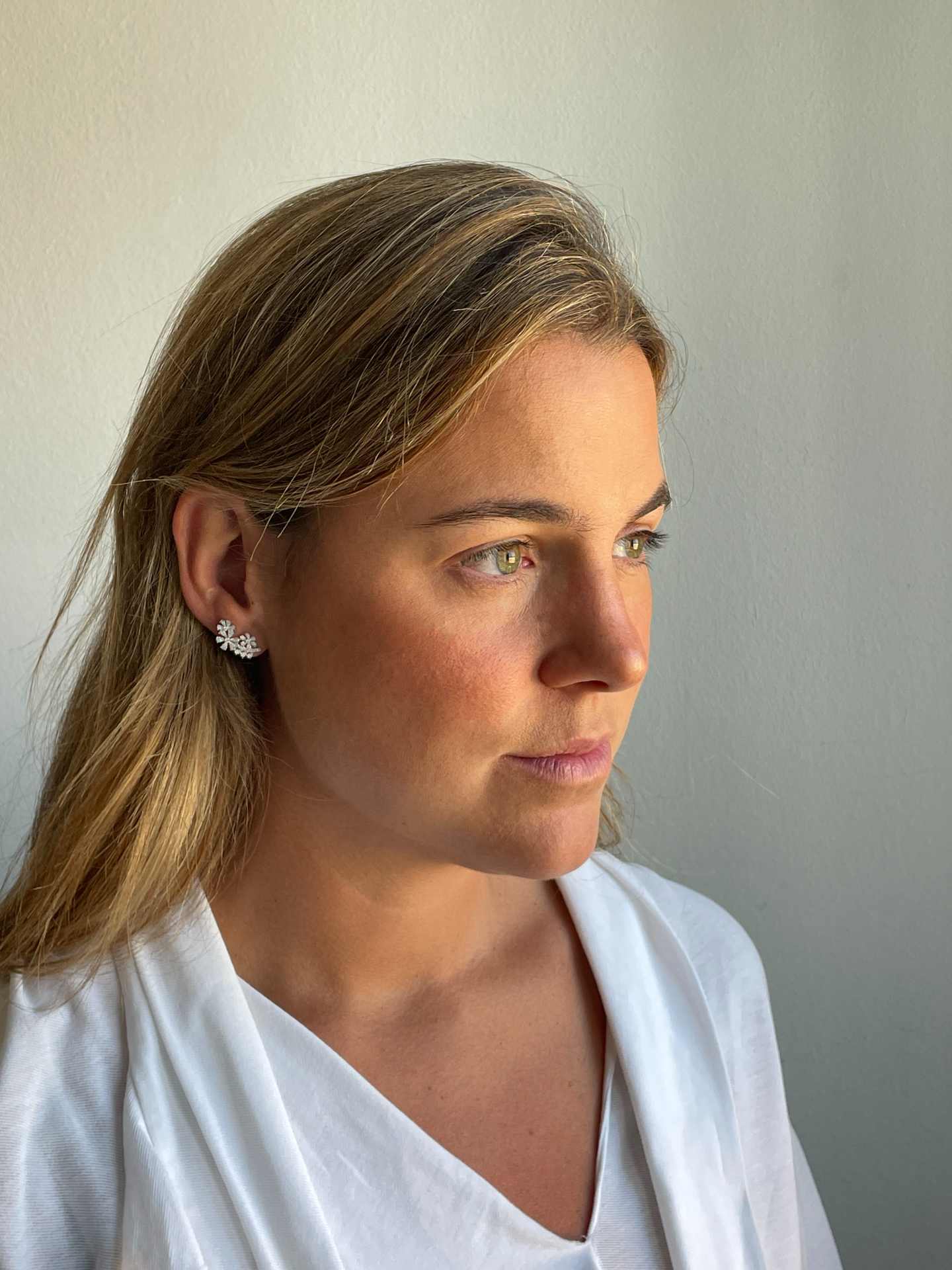 NOREÑA, es un pendiente flor super favorecedor que derrocha mucho estilo, realizado en oro blanco de 18 kilates con diamantes talla brillantes.