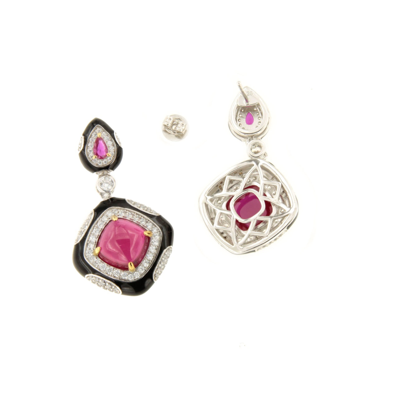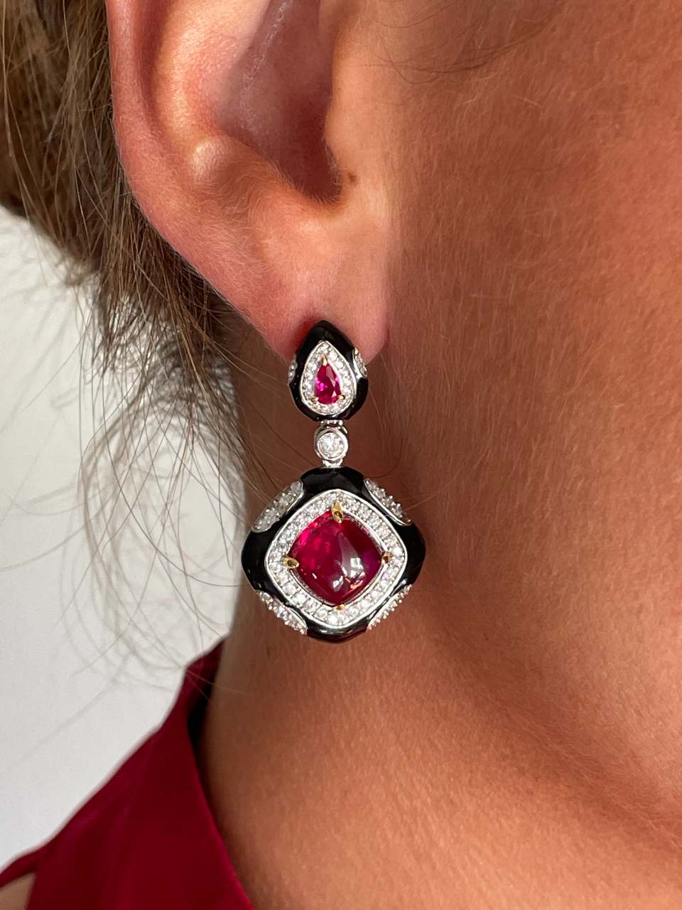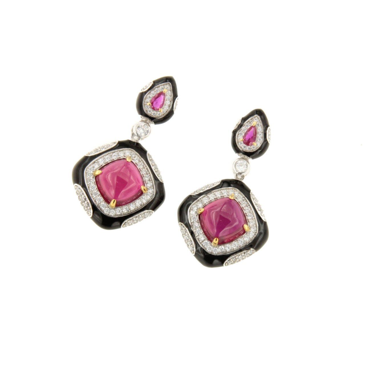 Realizados en plata de ley y adornados con circonitas blancas y rojas que imitan al rubí en talla cabujón, su diseño mezcla formas geométricas con un elegante esmaltado negro que recuerda al ónix, creando un contraste que no deja indiferente.