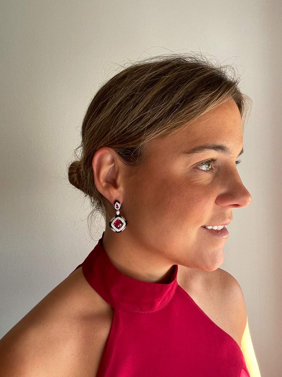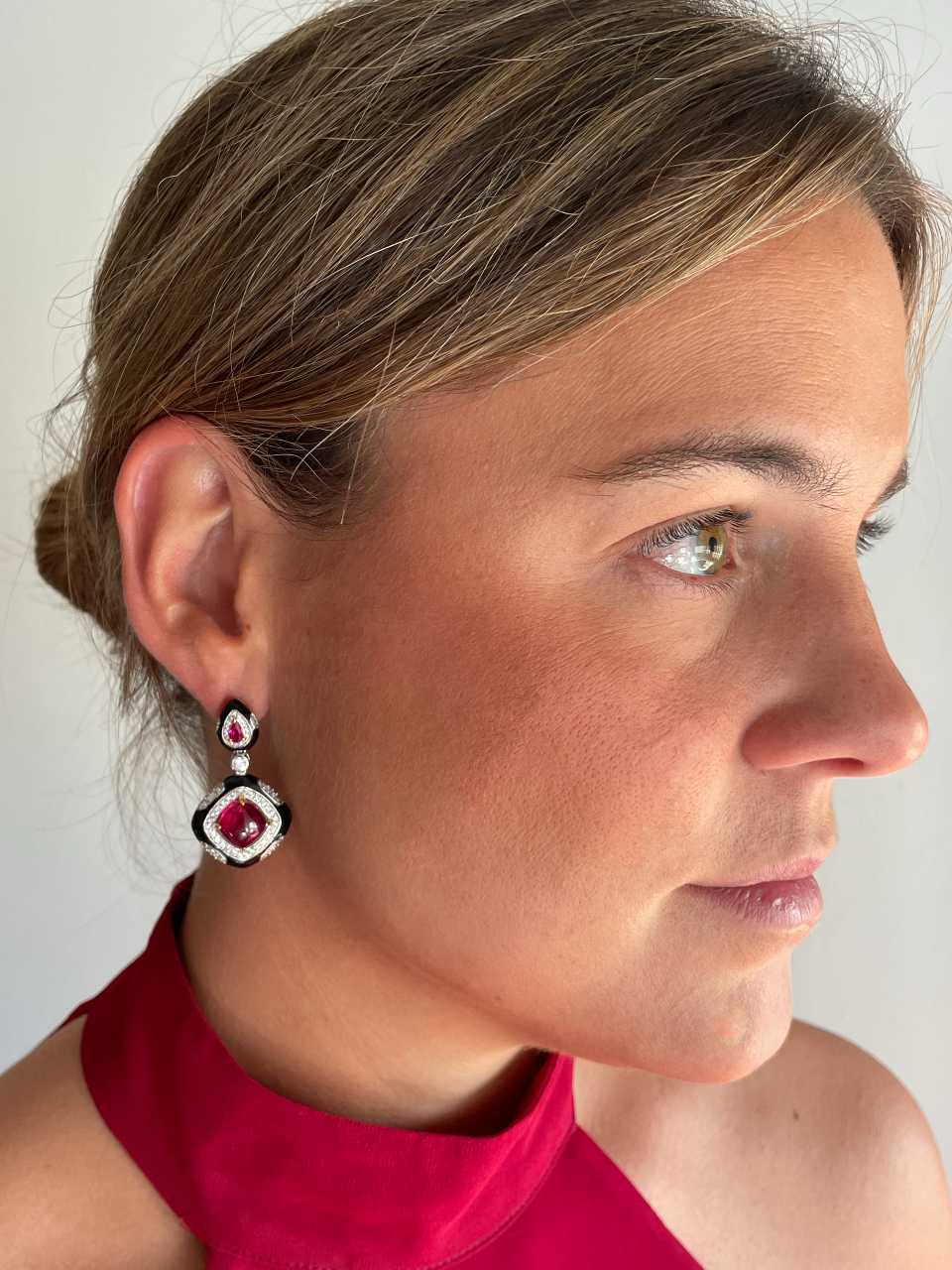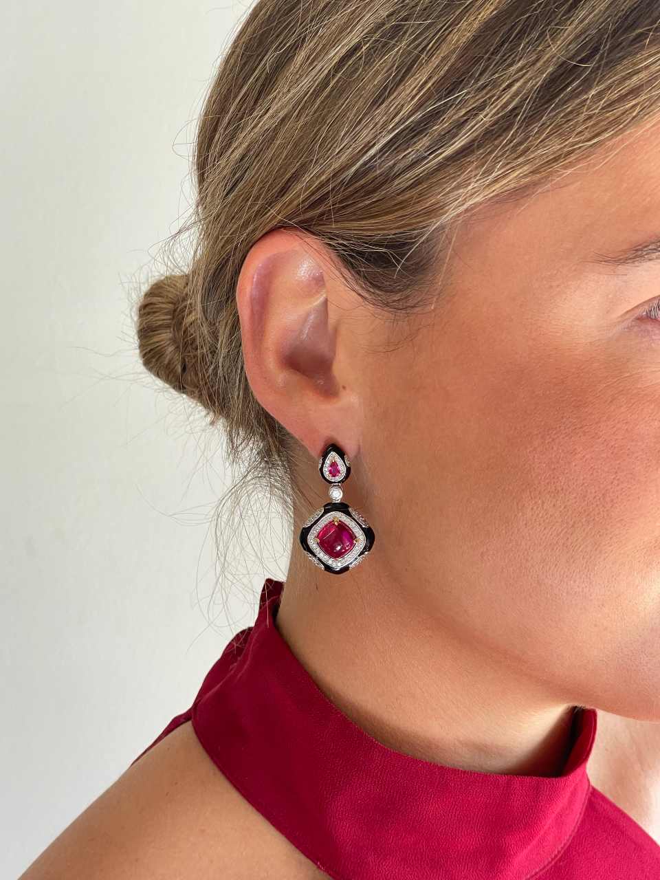 Realizados en plata de ley y adornados con circonitas blancas y rojas que imitan al rubí en talla cabujón, su diseño mezcla formas geométricas con un elegante esmaltado negro que recuerda al ónix, creando un contraste que no deja indiferente.
