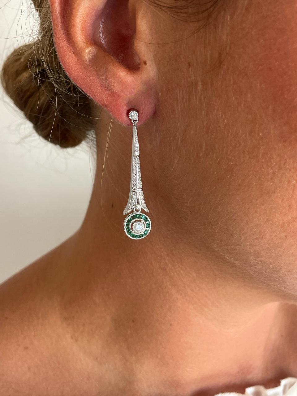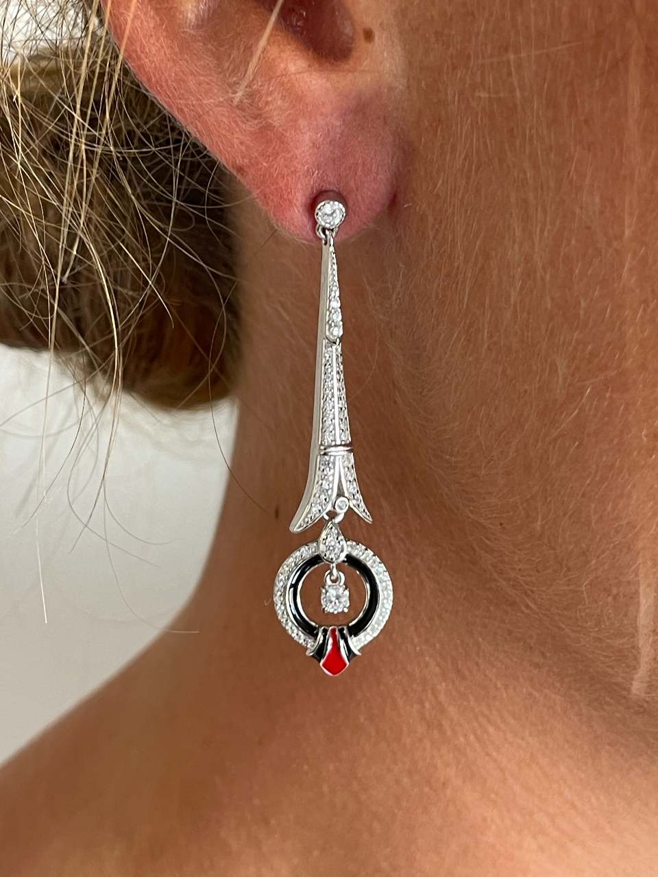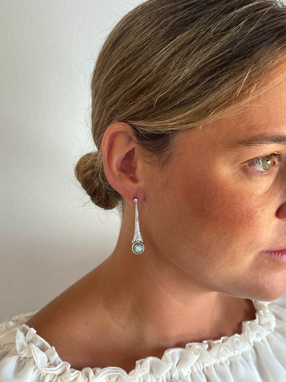 CAULKER son unos pendientes desmontables elegantes y deslumbrantes, ideales para novias e invitadas que quieran destacar en su gran día y busquen una pieza art decó con un toque de color.