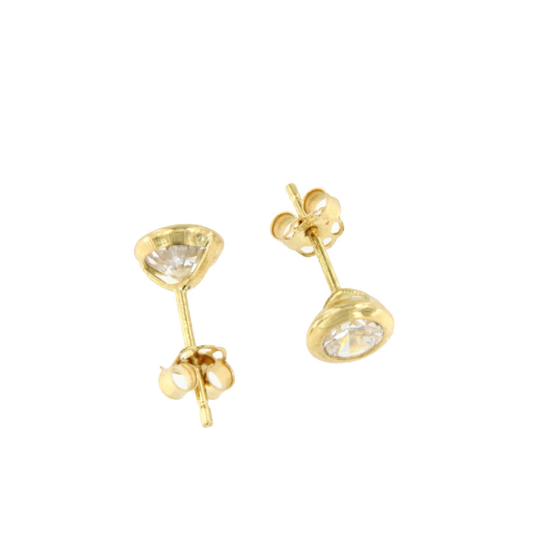 NAZARE, son unos pendientes tipo dormilones que llevan engastadas unas circonitas en una boquilla realizada en oro amarillo de 18 kilates. Los cierres son de presión clásica.