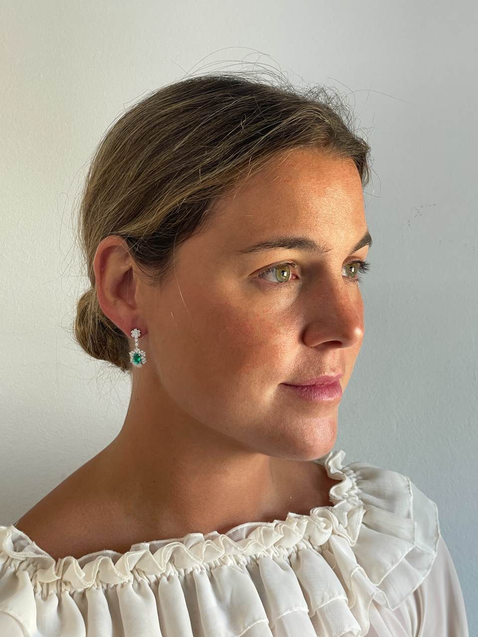 Pendientes TUNO largos oro blanco 18 ktes roseta esmeralda y brillantes
