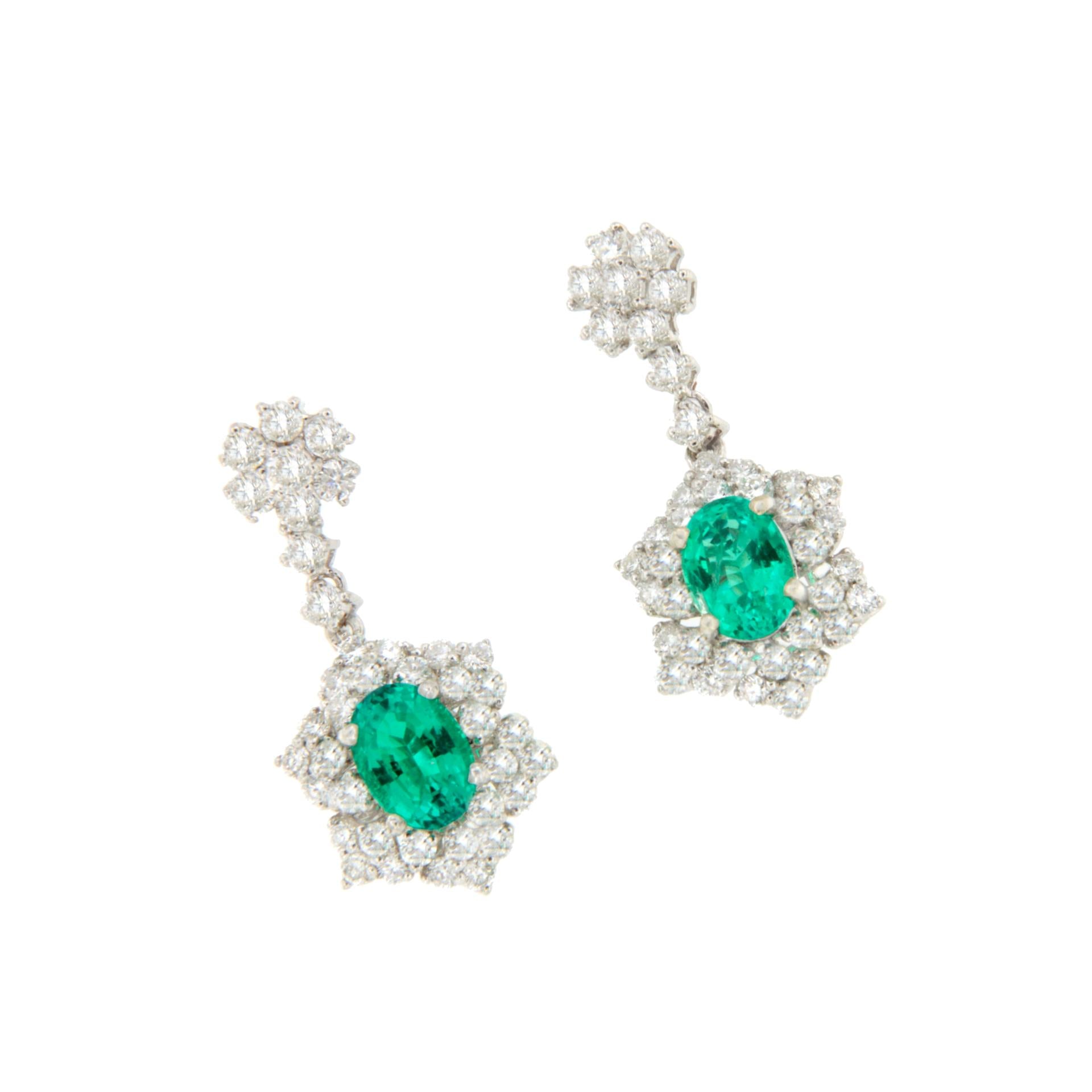 TUNO, precioso pendiente largo de esmeralda oval en roseta tipo flor con brillantes, que cuelga de una roseta de brillantes, realizado en oro blanco de 18 kilates. ¡Maravillosos!.