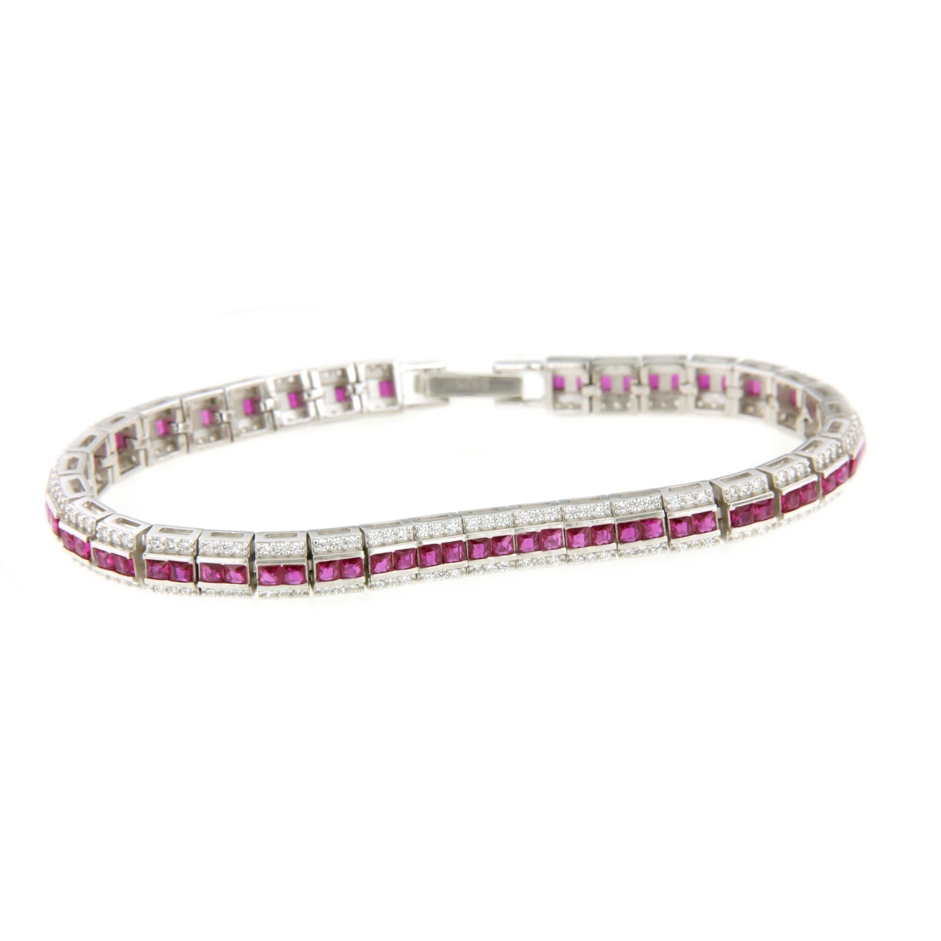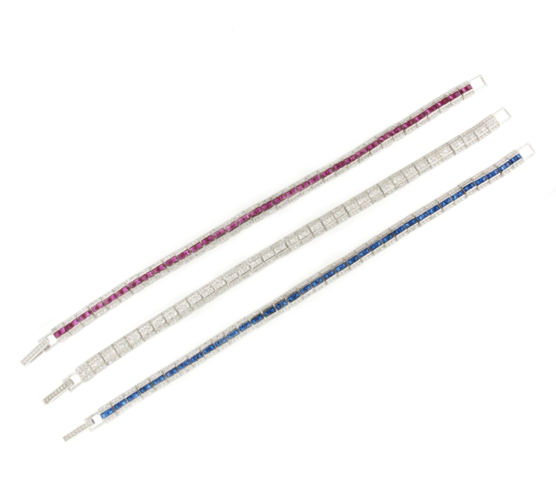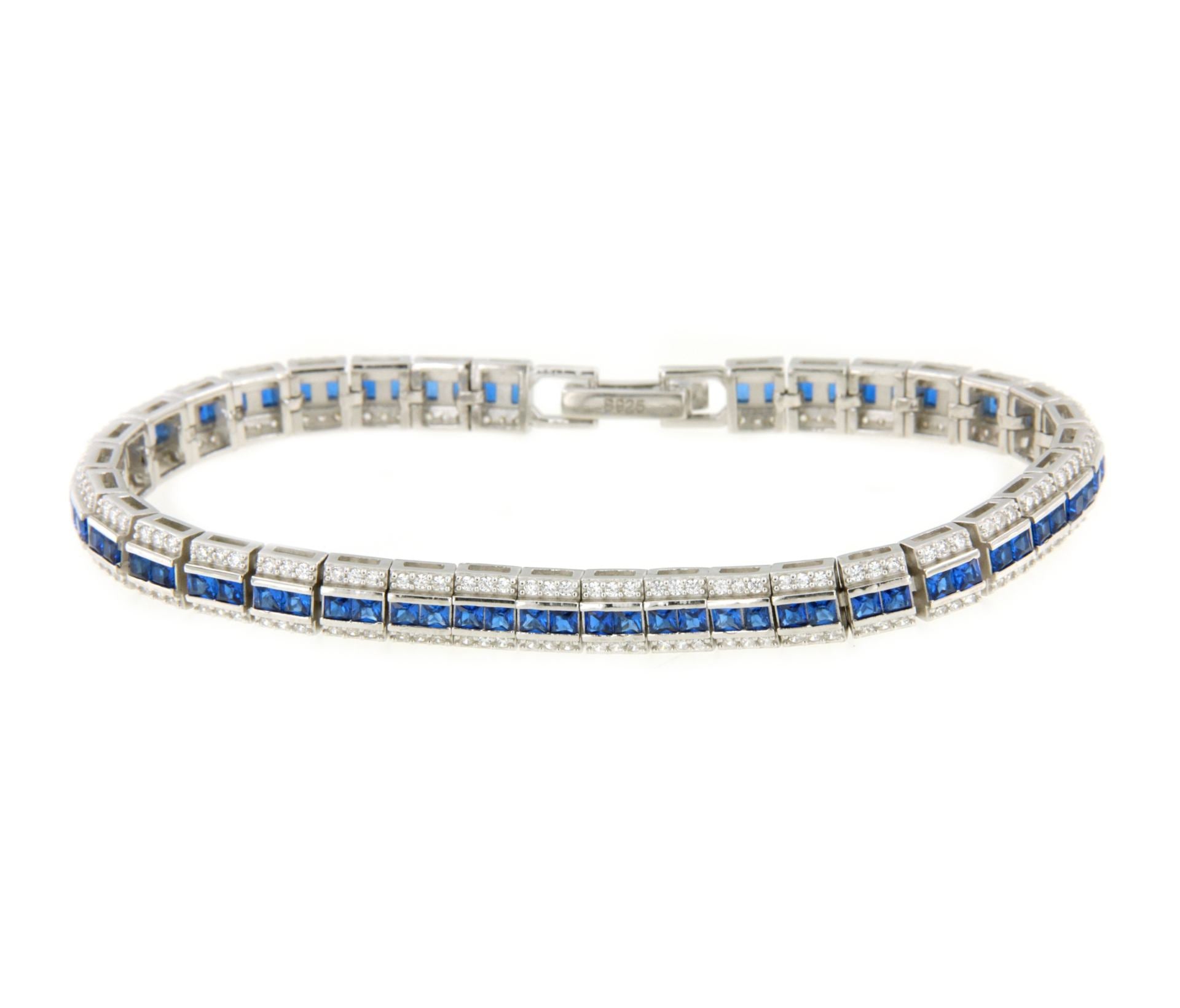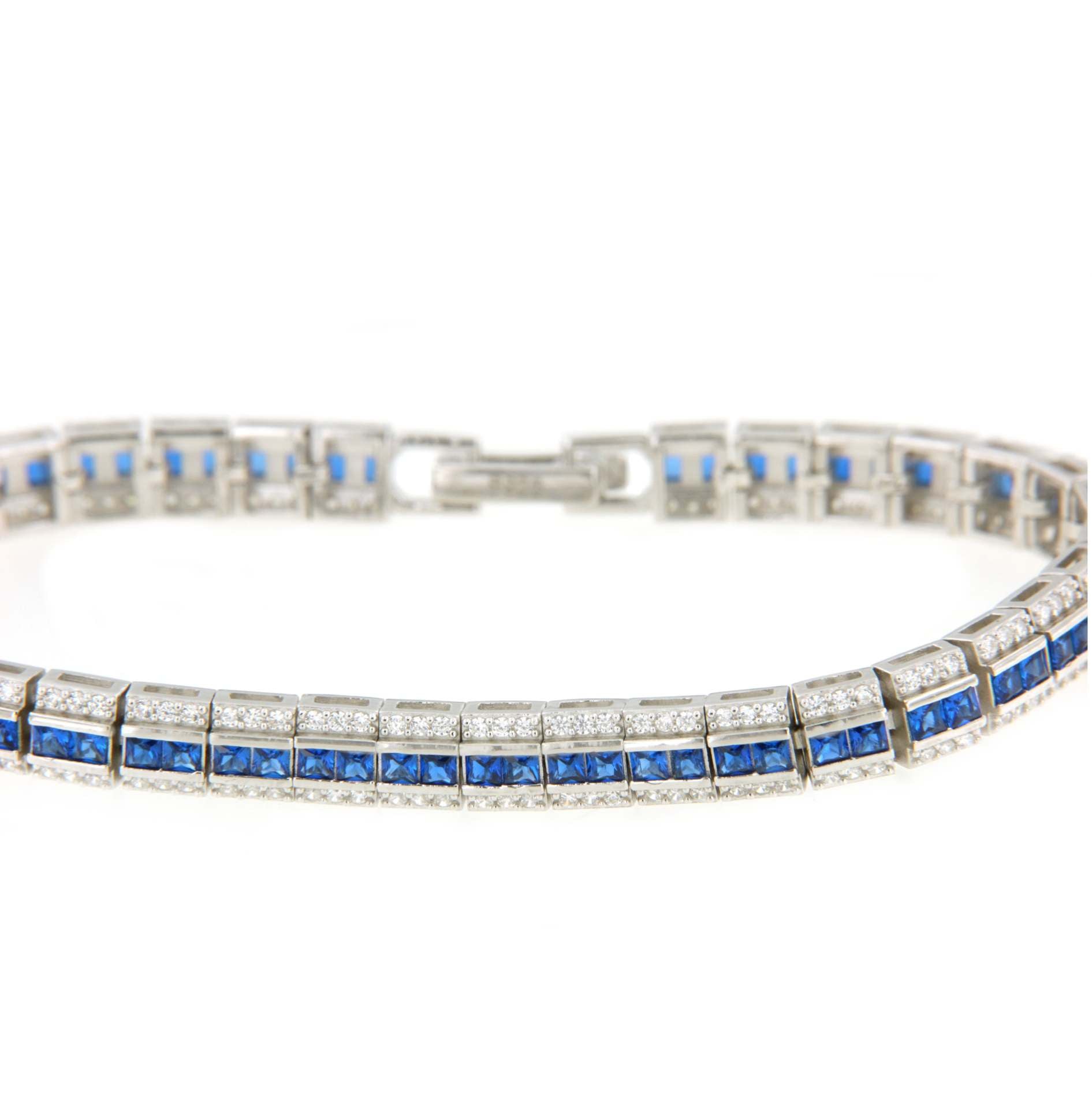PORTOFINO es una pulsera estilo art decó, realizada en plata de primera ley con rodio, compuestas por circonitas redondas y piedras de colores en talla carre: circonitas, espinela azul y corindón rojo.