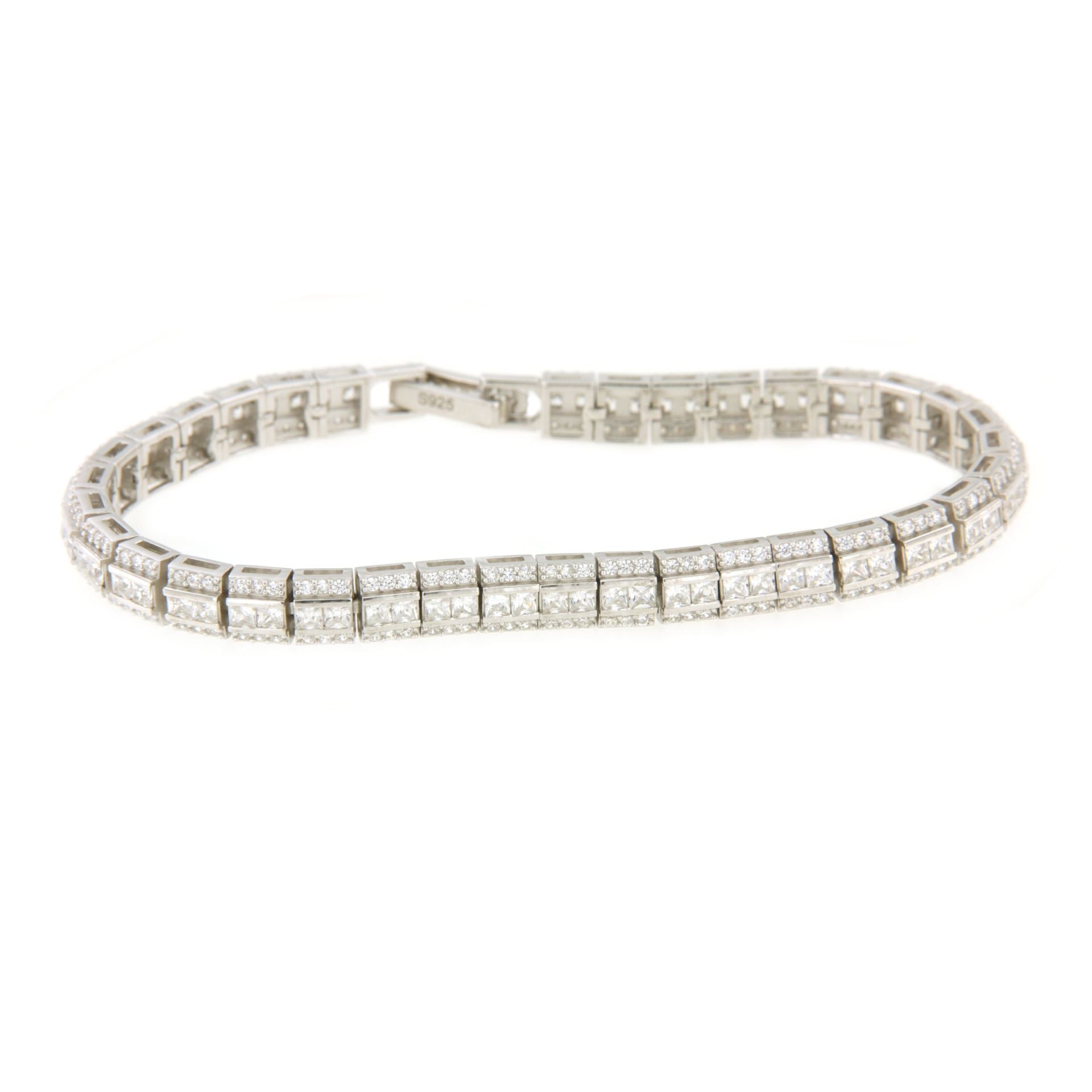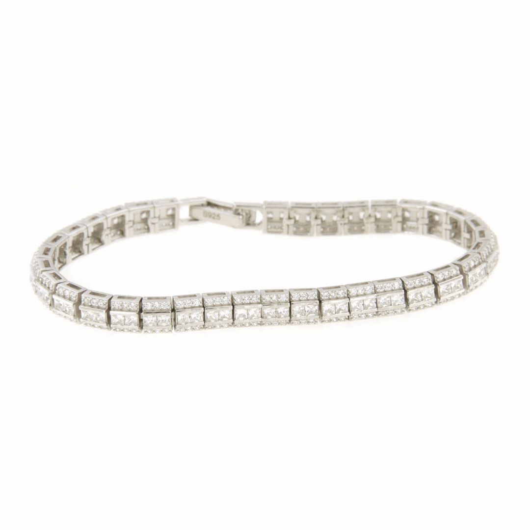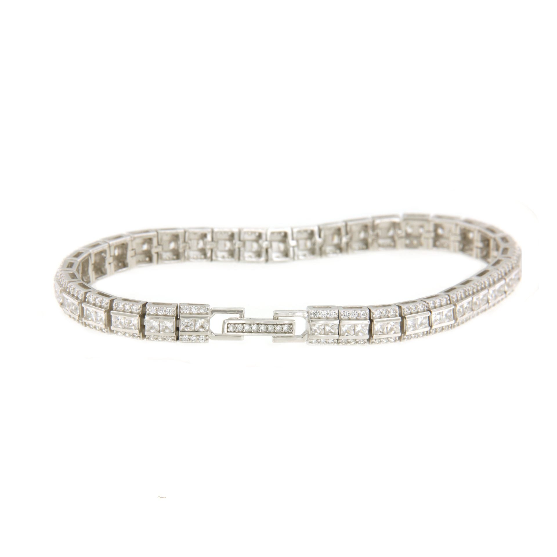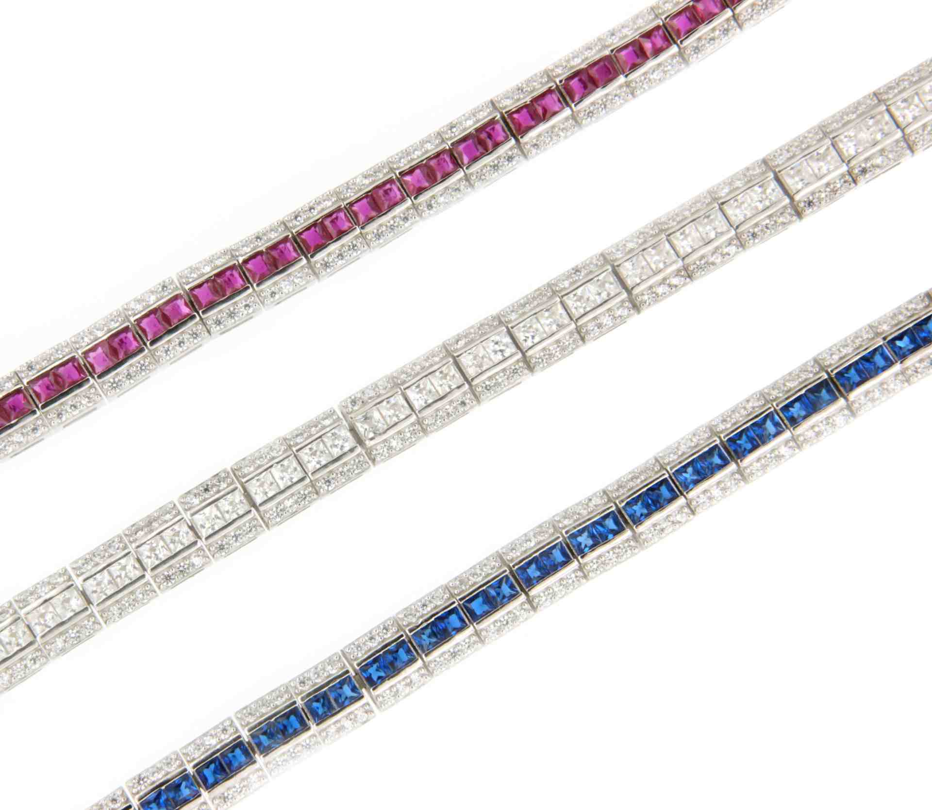 PORTOFINO es una pulsera estilo art decó, realizada en plata de primera ley con rodio, compuestas por circonitas redondas y piedras de colores en talla carre: circonitas, espinela azul y corindón rojo.